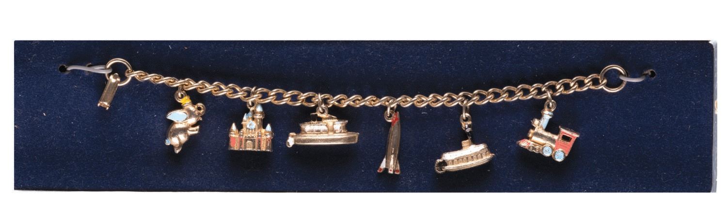 (Disneyland, 1960s) A souvenir charm bracelet featuring (6) Disneyland attraction-themed charms. The chain measures 6" long and the bracelet is in good unused condition, in its 8"x1.25"x1" original box.