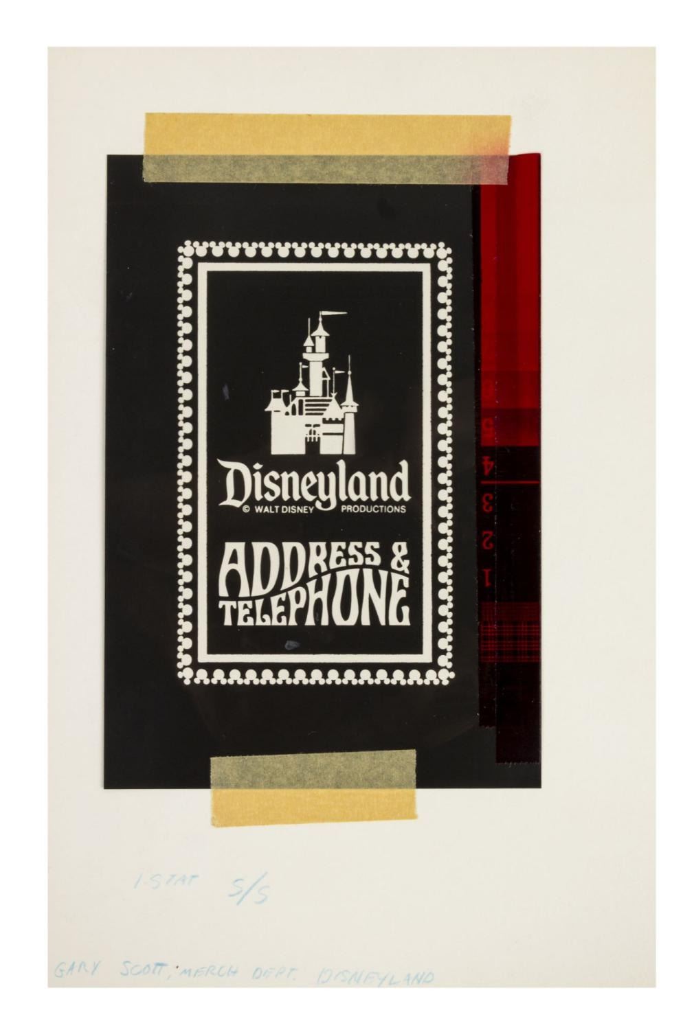 (Disneyland, 1960s) A negative cel layer used to produce the cover of Disneyland's Address & Telephone books. The cel layer is adhered to an artist board with hand-written development notes along the bottom edge. Measuring 5” x 7” on 7” x 10.5” artist board, the piece displays in very good condition with light scratches, scuffs, and wear from production use.