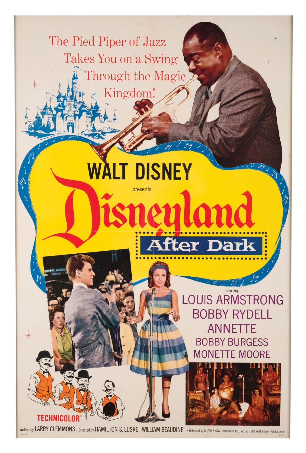 (Disneyland, 1962) An original one sheet poster for"Disneyland After Dark." The production first appeared as an episode of the Disneyland TV Show and featured popular musicians as well as introducing the Osmond Brothers. First airing on April 15, 1962, the episode was subsequently released as a short film in cinemas later that year. Measuring 27"x41", the poster is in good overall condition with minor wear along original folds, scuffs, and wear from handling and age.