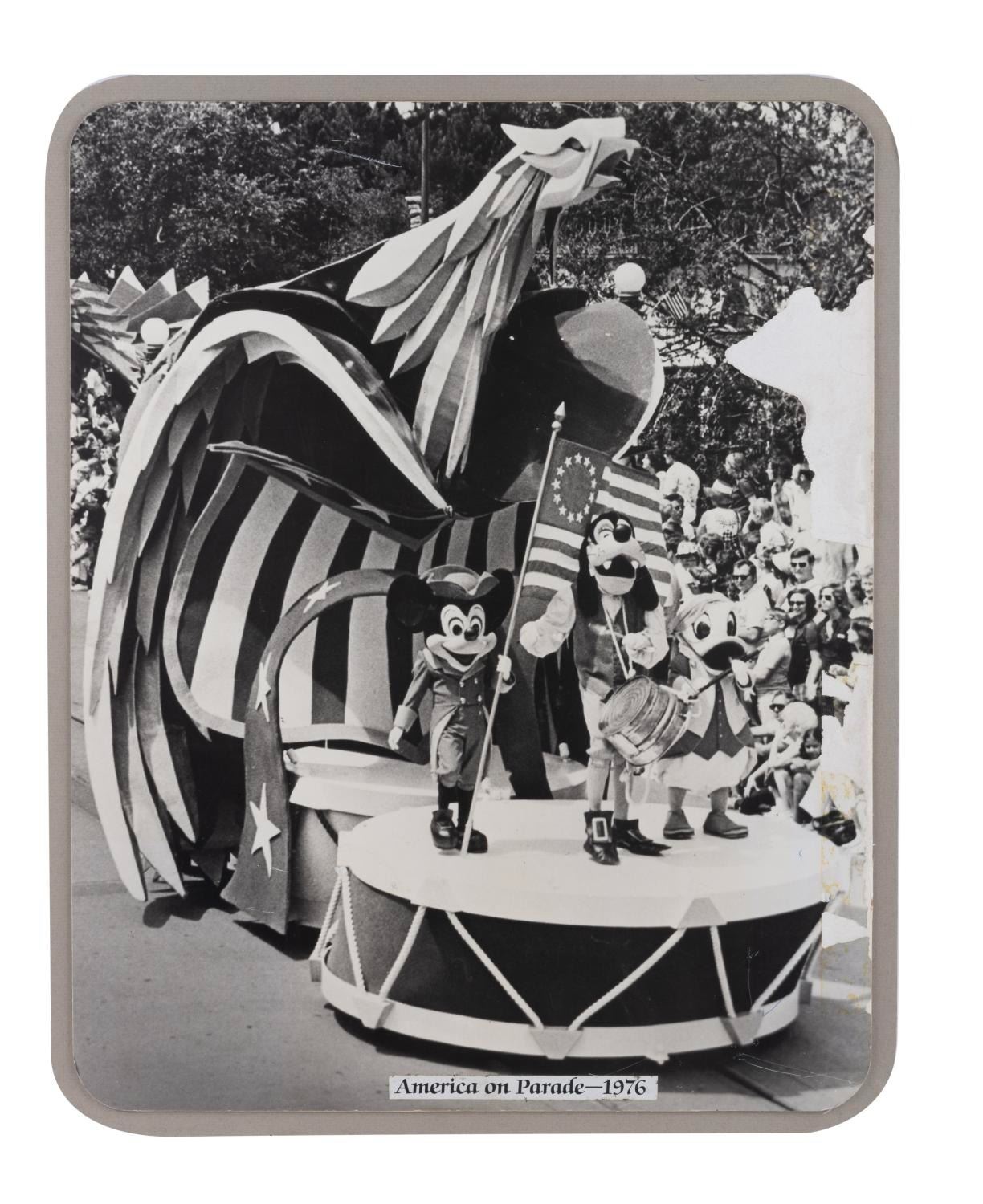 (Disneyland, 1990s) An America on Parade oversized photo. This piece features the “Spirit of ‘76” float with Mickey, Donald, and Goofy and was displayed at Disneyland Resort. Measuring 17” x 21” this large photo image is in very good condition exhibiting a 5.25” x 3” surface tear and original annotations on the back.
