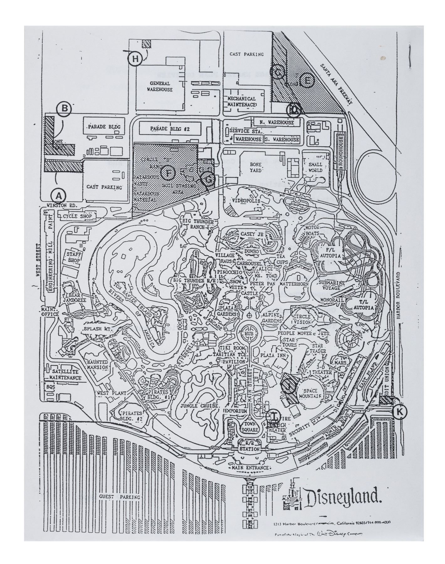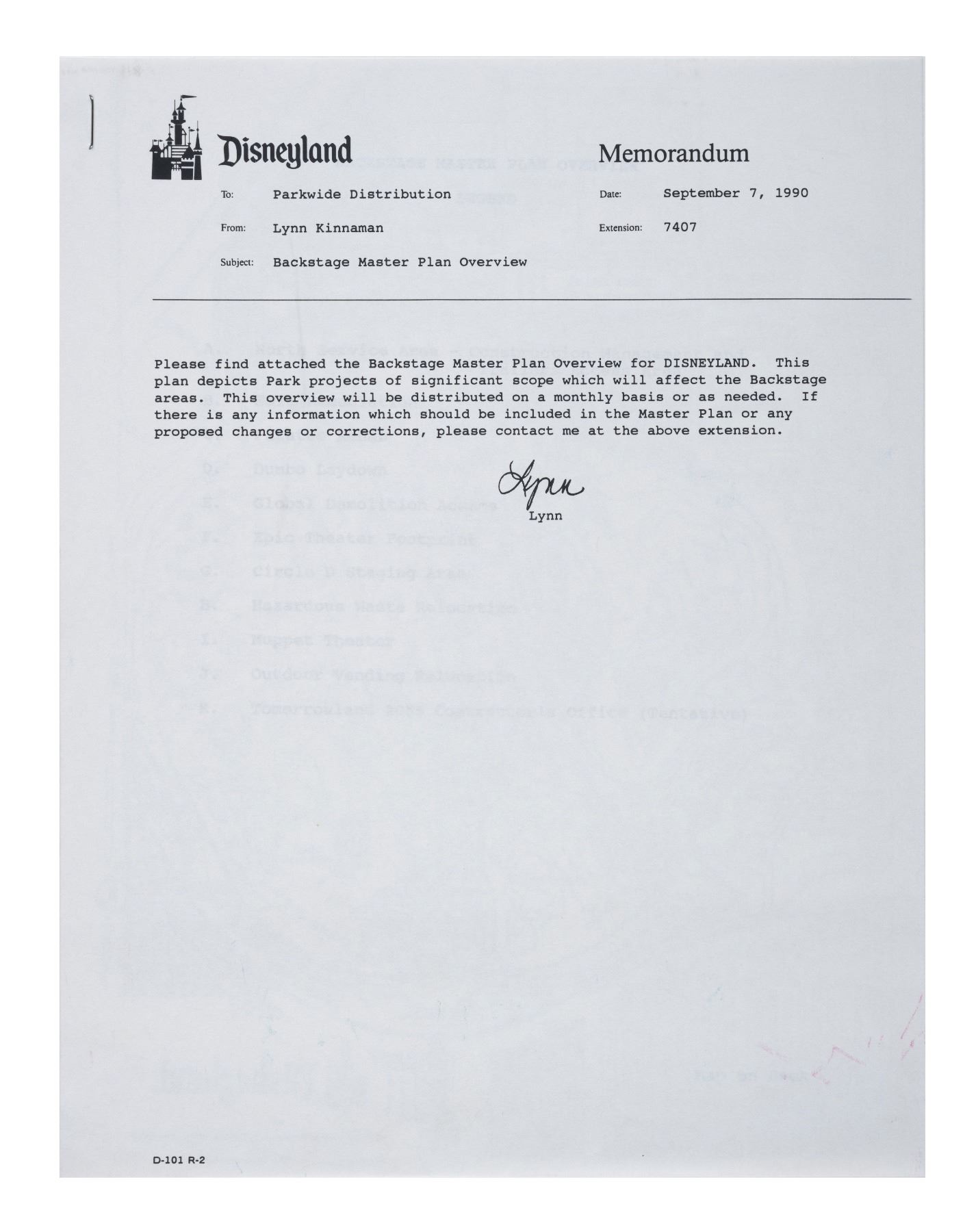 (Disneyland, 1990) A Disneyland Backstage Master Plan Overview. This two-page document was prepared for Park-wide distribution and features a cover letter, map, and legend related to Backstage areas affected by Park projects. Measuring 8.5"x11", this paper document is in very good Park-used condition, exhibiting a few pencil marks and minor wear to its pages.Est. Opening Bid: $25.00