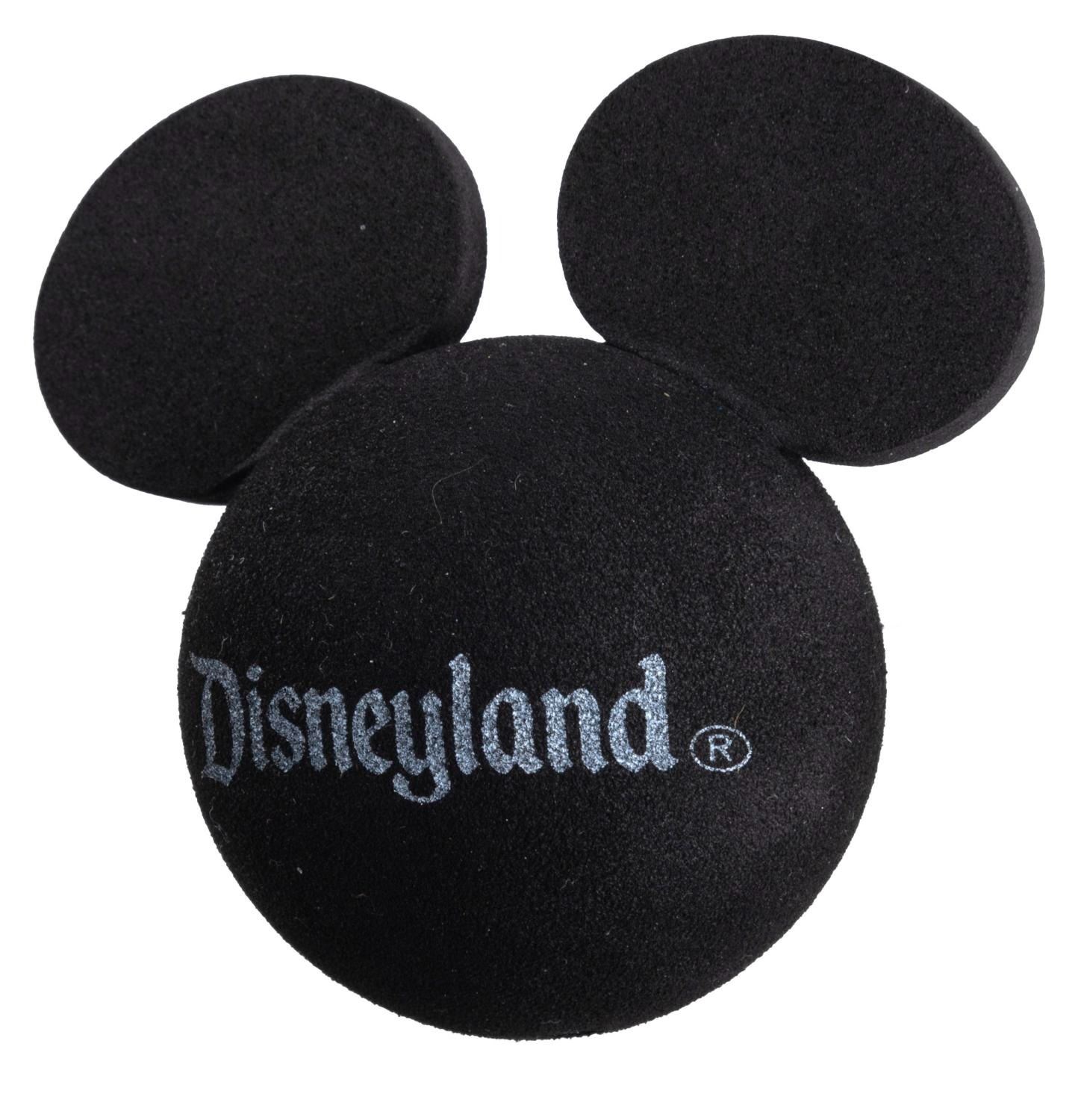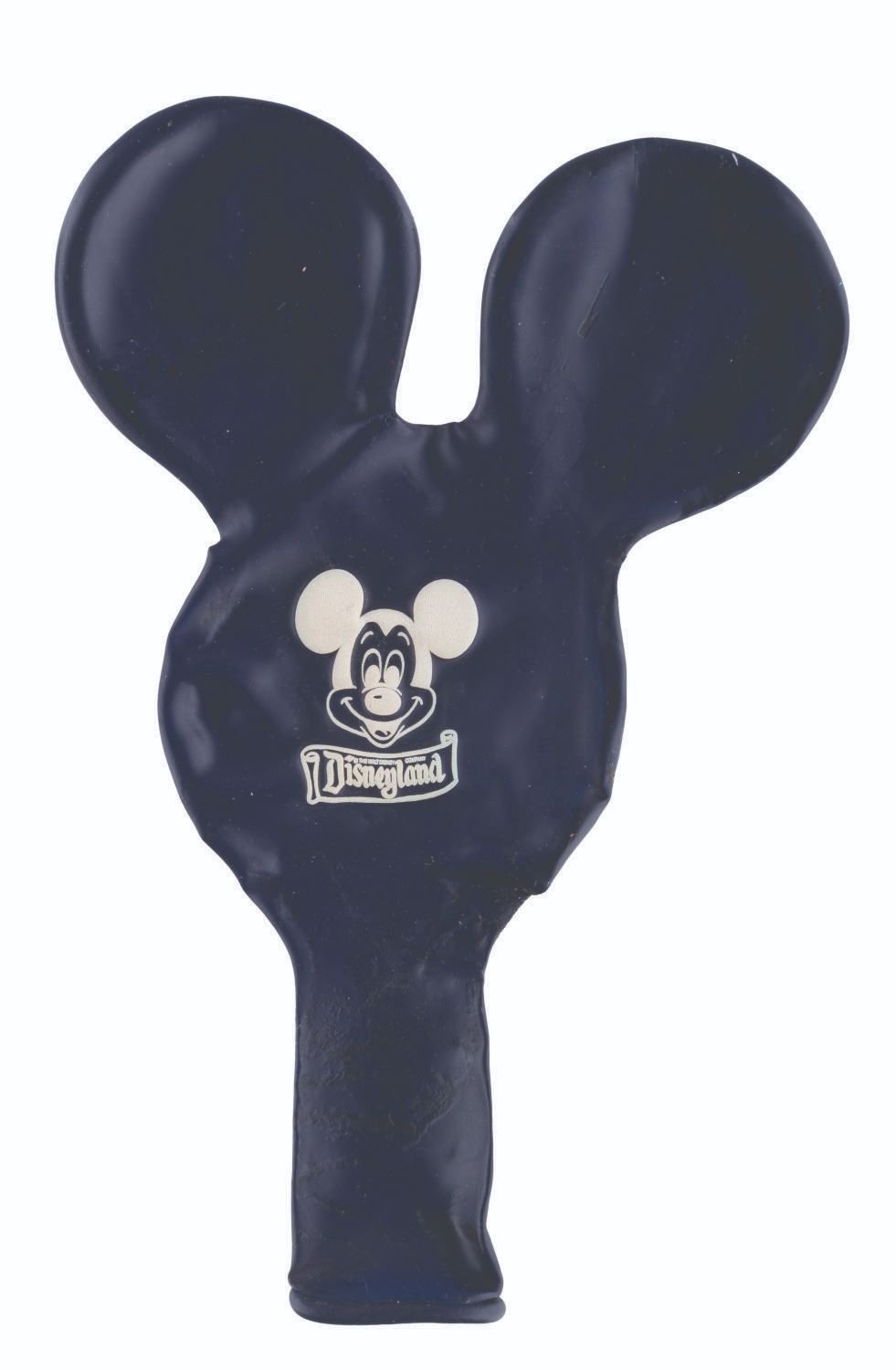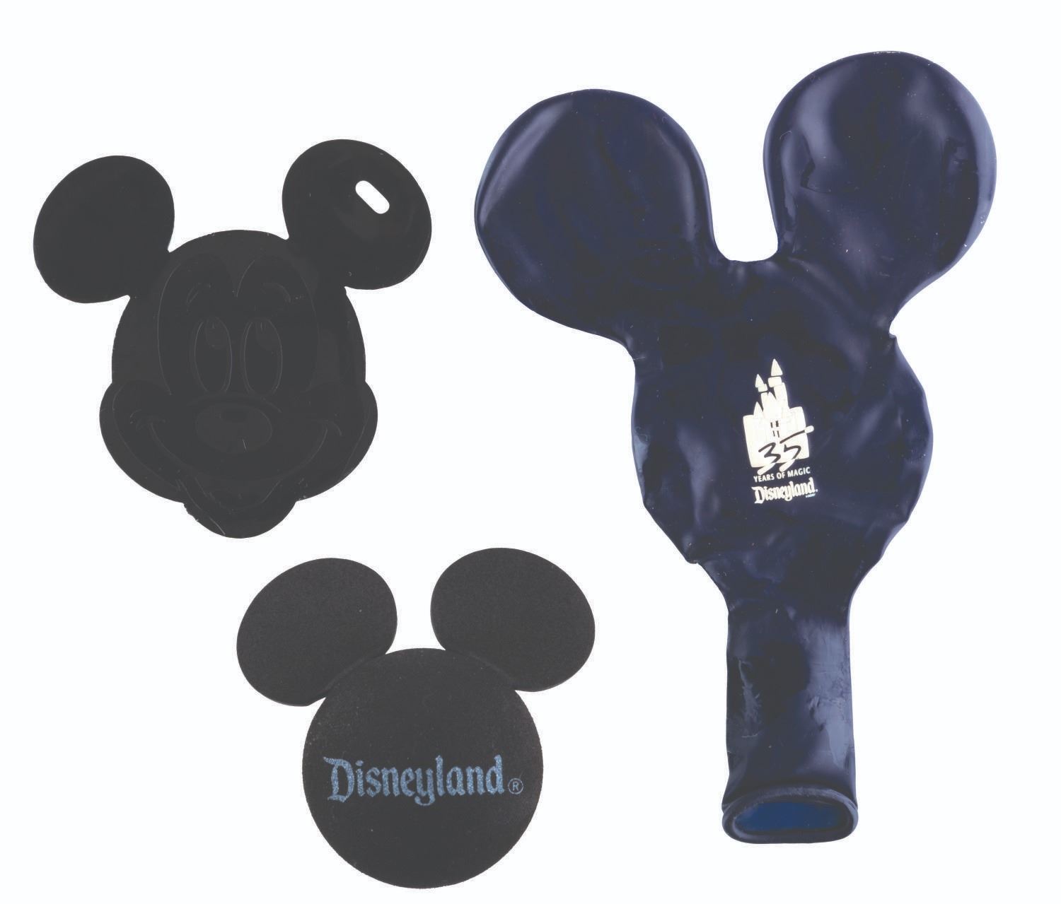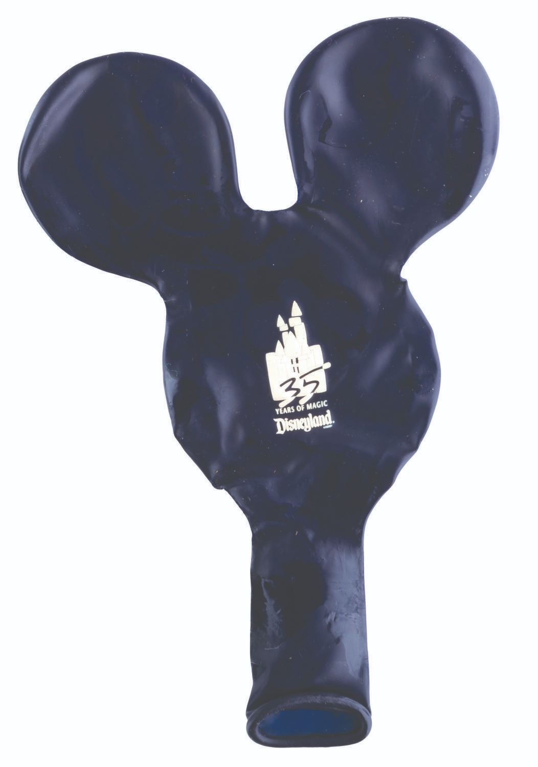 (Disneyland, 1990) A Disneyland 35th Anniversary balloon with a weight, and a Mickey Mouse antenna topper. The 4.25" x 6" deflated balloon and 3” x 3” weight are in good condition with some sticky areas to the balloon and light scuffs and scratches to the weight. The antenna topper measures 2.5" x 2.75", and is in fine condition.