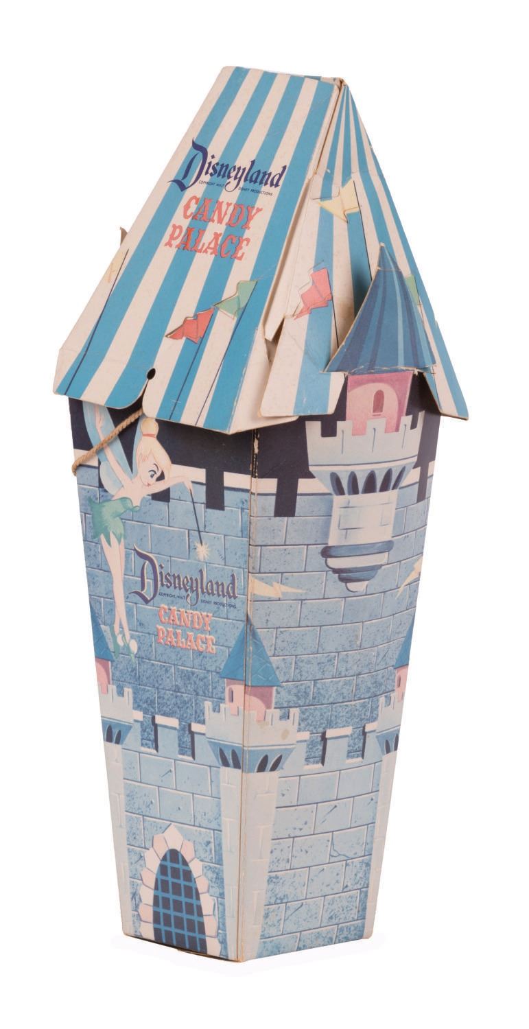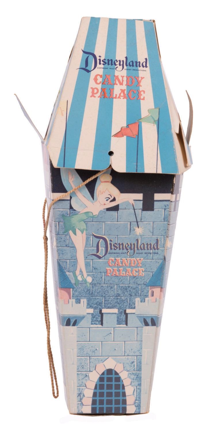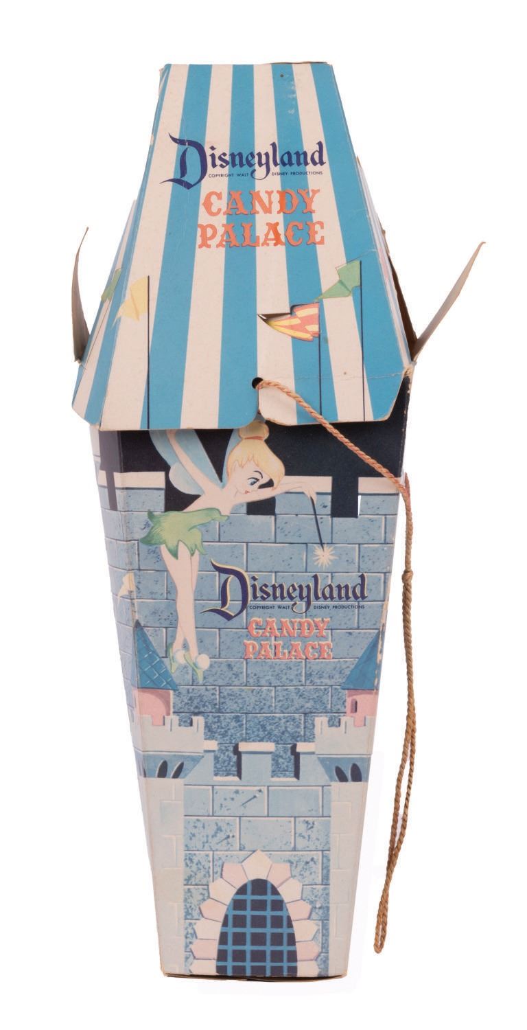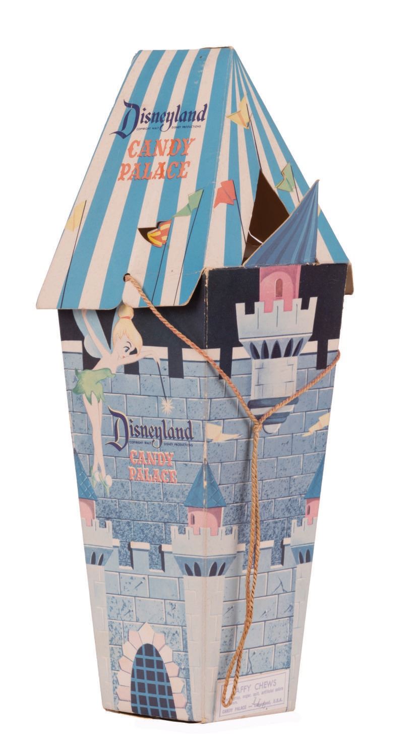 (Disneyland, 1960s) A Disneyland Candy Palace Taffy Chews Box. The colorful carton is in the shape of the Sleeping Beauty Castle and features Tinker Bell. This box retains a product label and was specifically used to package the Taffy Chews from the Candy Palace. Measuring 12.5" tall and 4.5"x4.5", the cardstock box is in good condition with color fading, creases to corners and wear to edges throughout from handling and age.