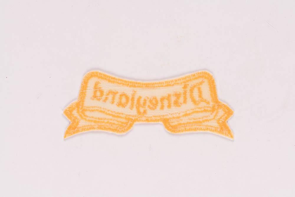 (Disneyland, 1980s-90s) A yellow Disneyland banner Cast Member embroidered uniform patch. Measuring 1.5" x 3.75", the patch is in fine unused condition.
