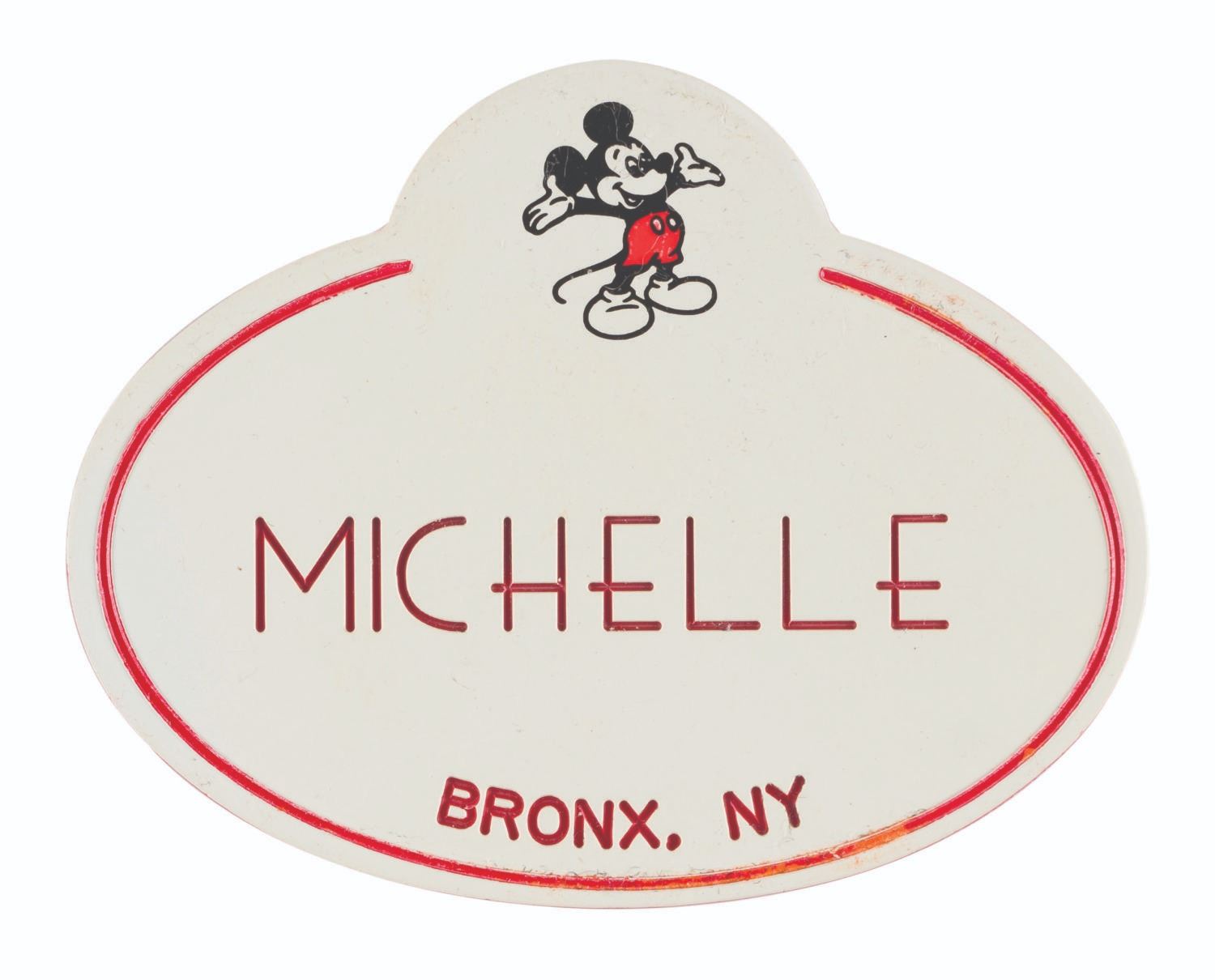 (Disneyland, 1990s) A Cast Member name tag with the name “Michelle” from the Bronx, New York. The tag measuring 2” x 2.5” is in fine condition.