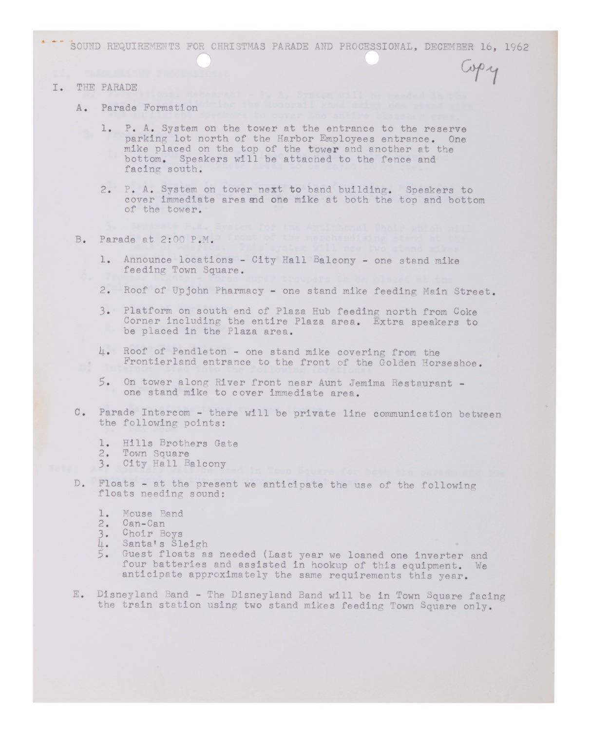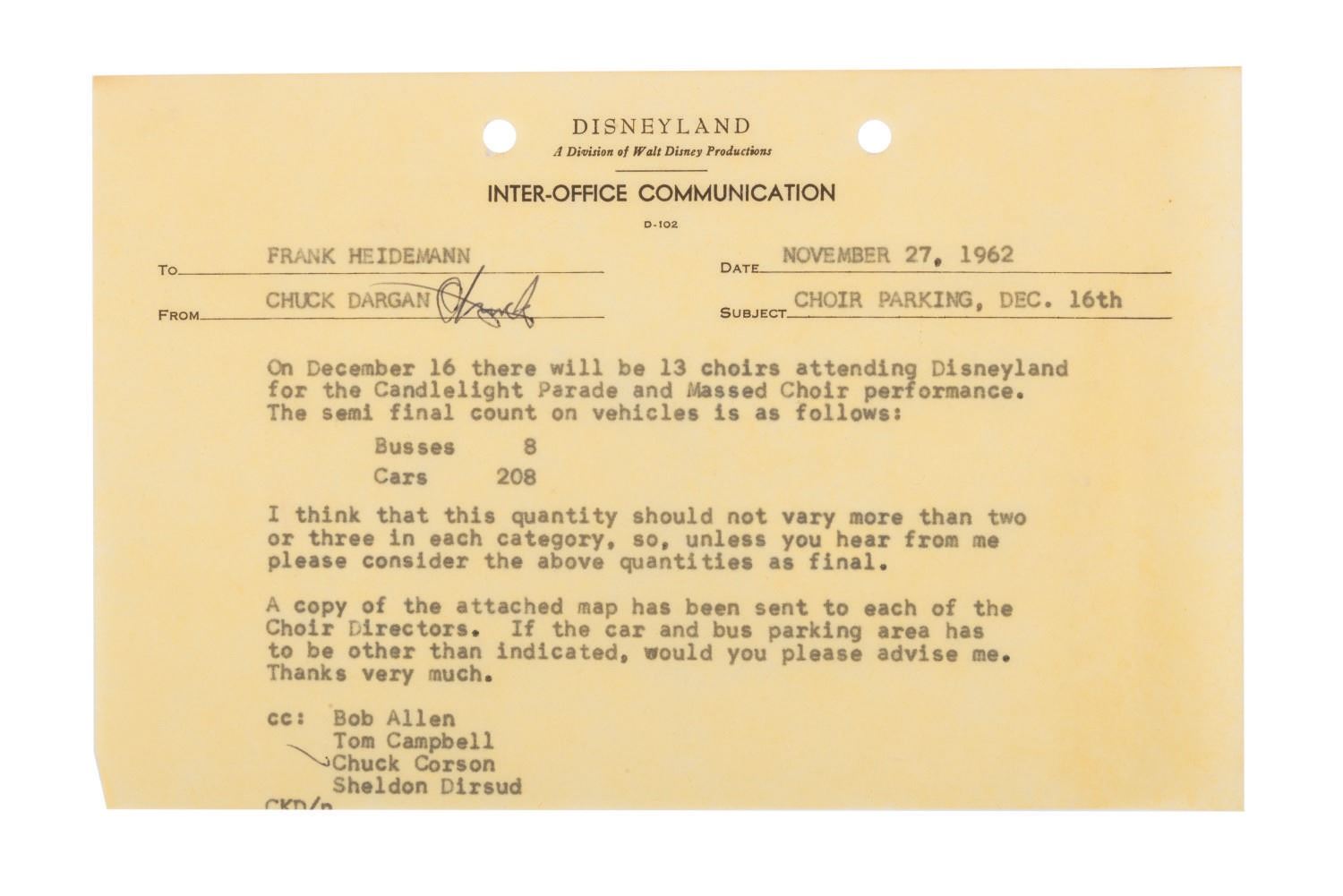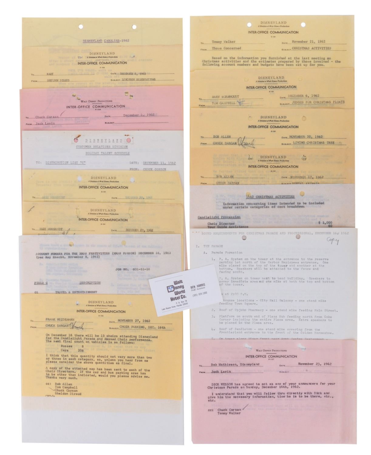 (Disneyland, 1962) A rare and unique archive of (25) Inter-Office Communications and documents relating to the Christmas Parade and Processional at Disneyland in 1962. The documents were prepared for those involved with the Entertainment Division of Disneyland. Among the collection are expense reports and messages detailing rentals and purchases, information about the sound requirements, for the units, floats, entertainers and related Christmas activities. The documents are presented within a vintage 1970s Walt Disney Distributing Co. folder. Measuring the between 8.5"x5.5" and 8.5"x11", the pages are in good condition overall with minor yellowing, fading, and wear from handling and age.