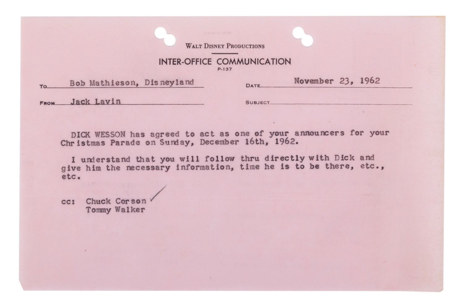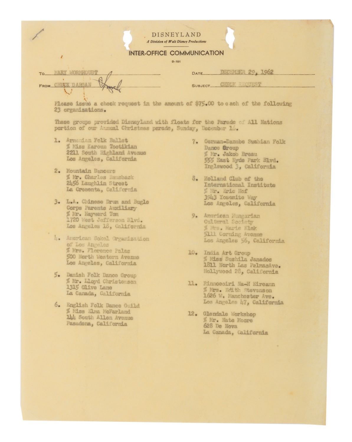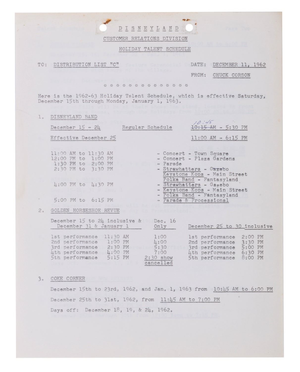 (Disneyland, 1962) A rare and unique archive of (25) Inter-Office Communications and documents relating to the Christmas Parade and Processional at Disneyland in 1962. The documents were prepared for those involved with the Entertainment Division of Disneyland. Among the collection are expense reports and messages detailing rentals and purchases, information about the sound requirements, for the units, floats, entertainers and related Christmas activities. The documents are presented within a vintage 1970s Walt Disney Distributing Co. folder. Measuring the between 8.5"x5.5" and 8.5"x11", the pages are in good condition overall with minor yellowing, fading, and wear from handling and age.