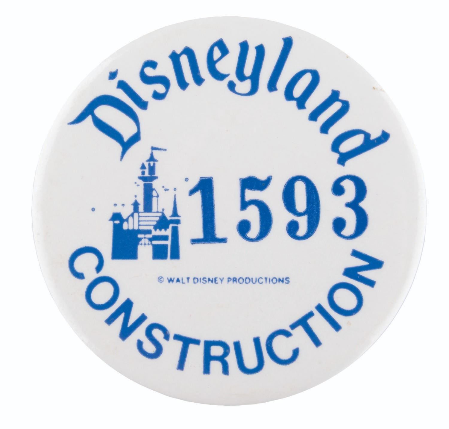 (Disneyland, 1960s-80s) A Disneyland Construction ID button numbered "1593” worn by an outside contractor hired for work at the Park. Measuring 2” in diameter, the button is in very good condition with light tarnish on the reverse.