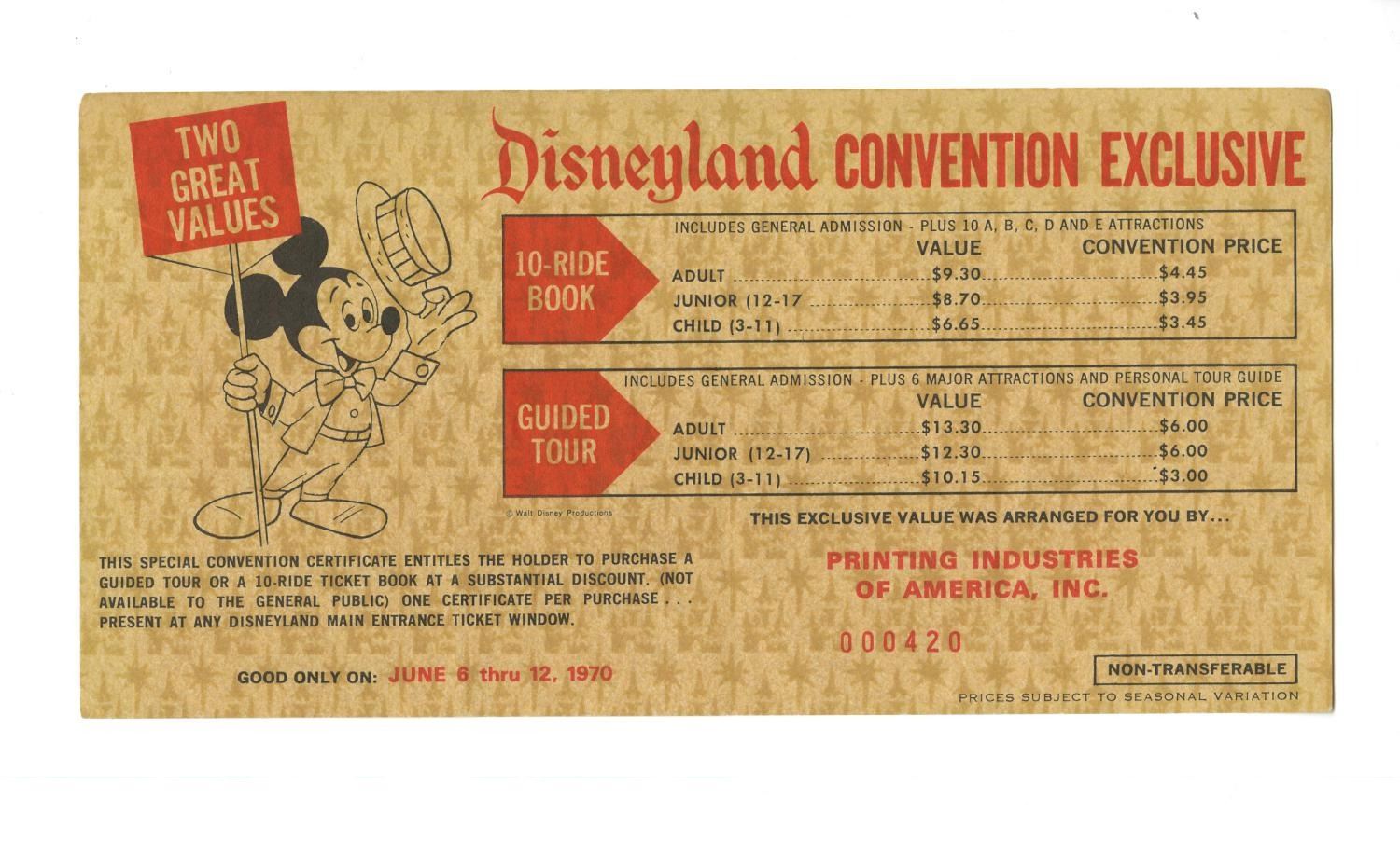 (Disneyland, 1970) A special ticket book certificate which allowed the holder to purchase a Disneyland guided tour or a 10-ride ticket book at a "substantial discount." The certificate is titled "Disneyland Convention Exclusive" and was issued in partnership with the Printing Industries of America, Inc. Next to the image of Mickey Mouse are the discounted prices for ticket books and tours. Measuring 3.5" x 7", the certificate is in very good condition. The certificate is marked as number 000420 on the Disneyland Castle logo paper.