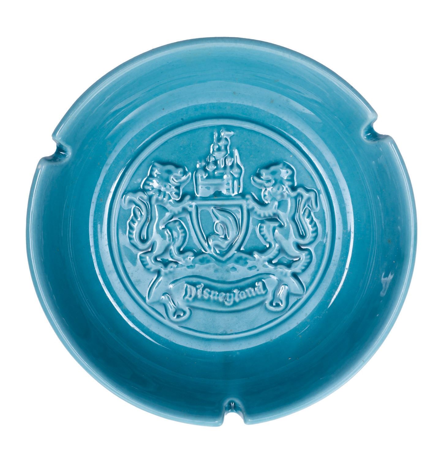 (Disneyland, 1950s) An early souvenir ashtray of Disneyland with the original box. The ceramic ashtray features the official crest of Disneyland in relief at its center and retains a Disneyland ink stamp on the reverse. Measuring approximately 6.25" in diameter, the ashtray is in fine unused condition. Measuring 6.75"x6.75" and 1.5" deep, the box is in very good condition with wear to edges and corners.