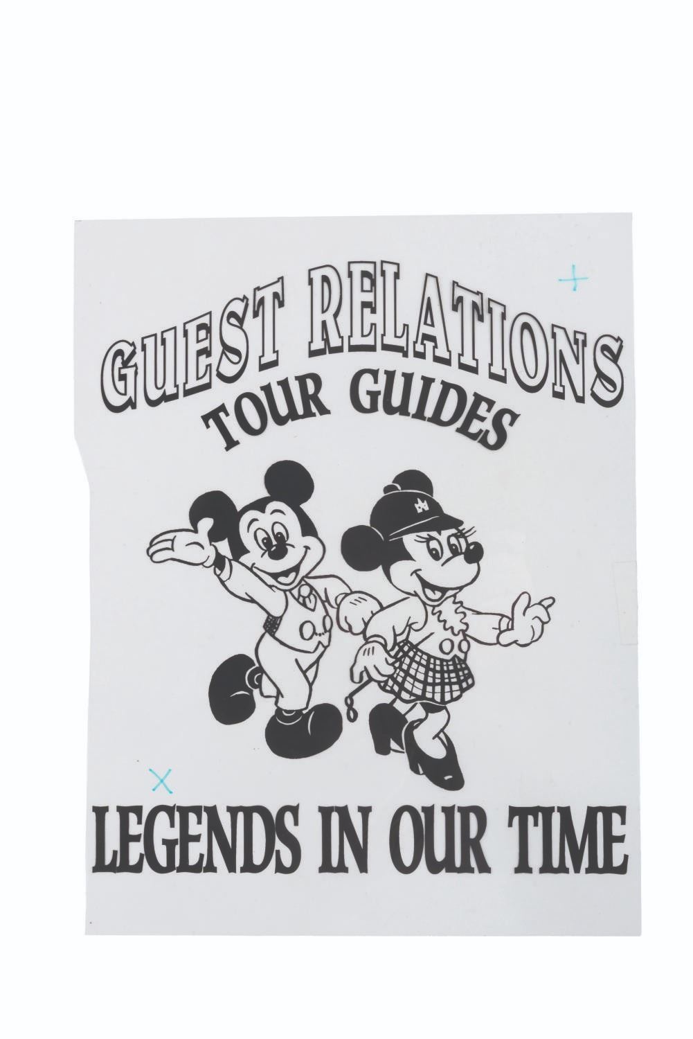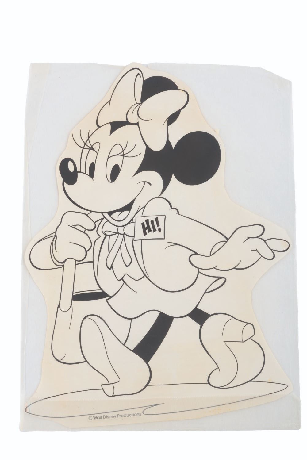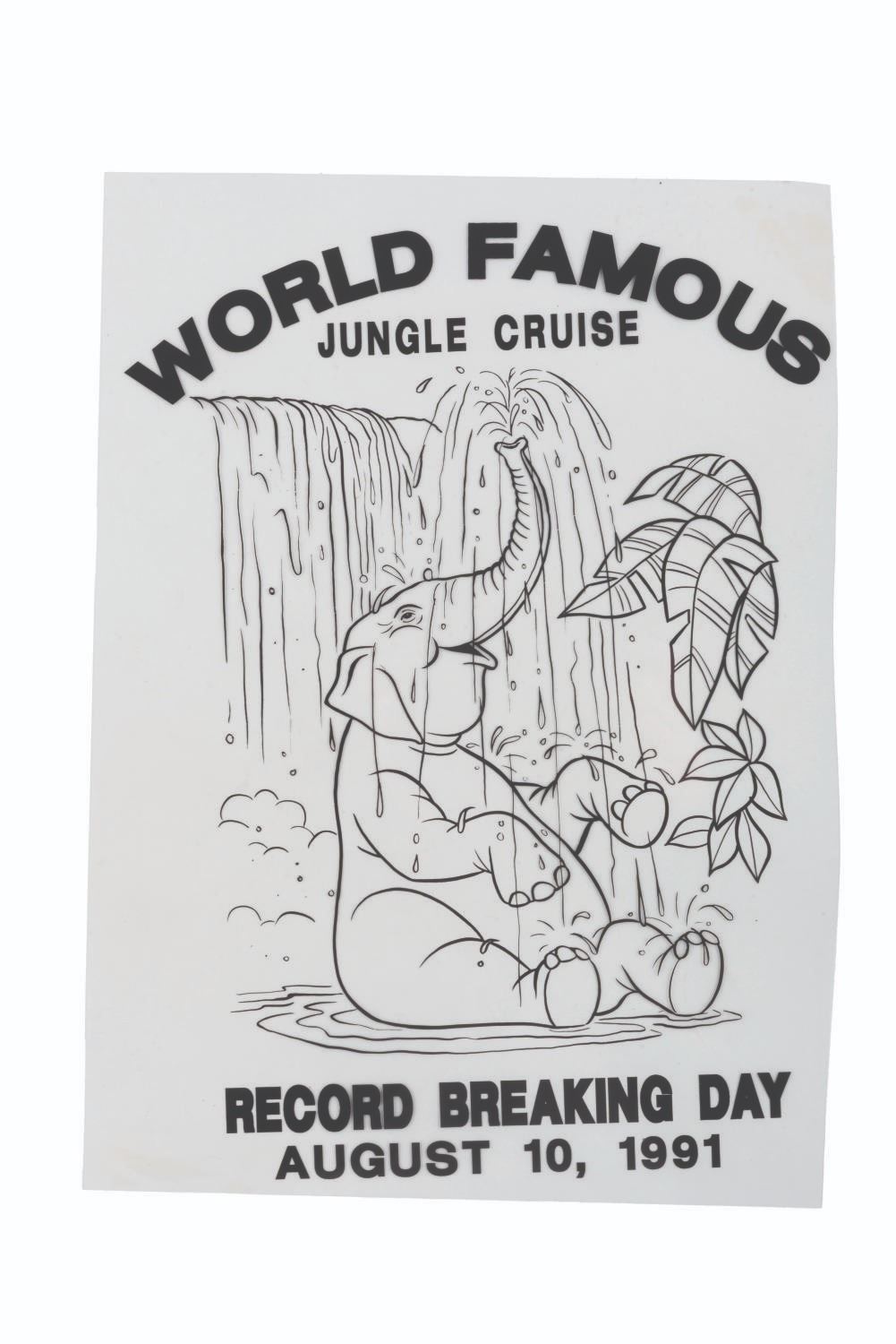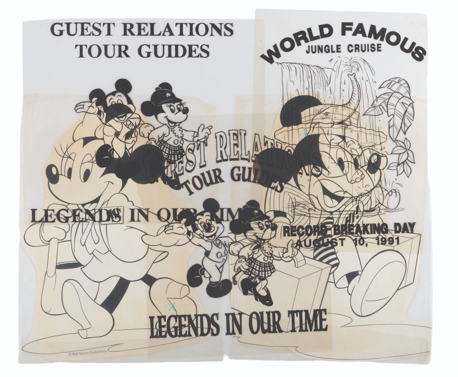 (Disneyland, 1991) A collection of Disneyland development artwork. Included are five prints on acetate featuring the Jungle Cruise, Disneyland Tour Guides, and Mickey and Minnie with "Hi!" name tags. Measuring 10" x 14" to 12" x 15.5", the prints are in good condition with handling wear, creasing, and folds.