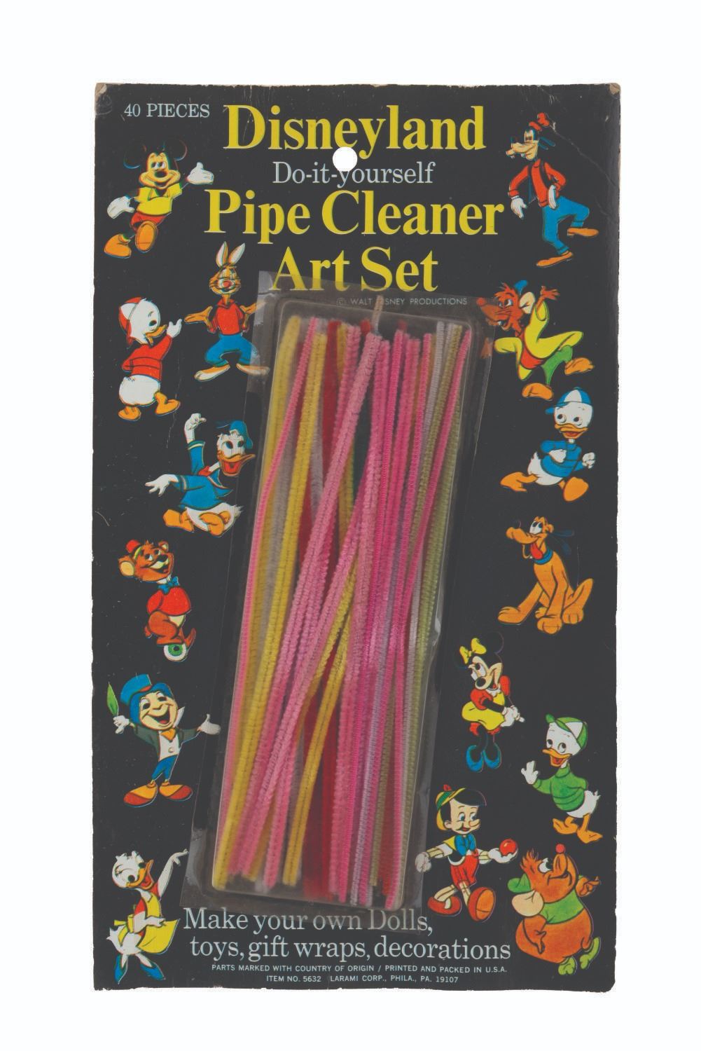 (Disneyland, 1950s) A souvenir Do-it-yourself pipe cleaner art set from Disneyland. Measuring 8” x 14”, the set is in good condition sealed on the original card, with warping and handling wear to the card from age.