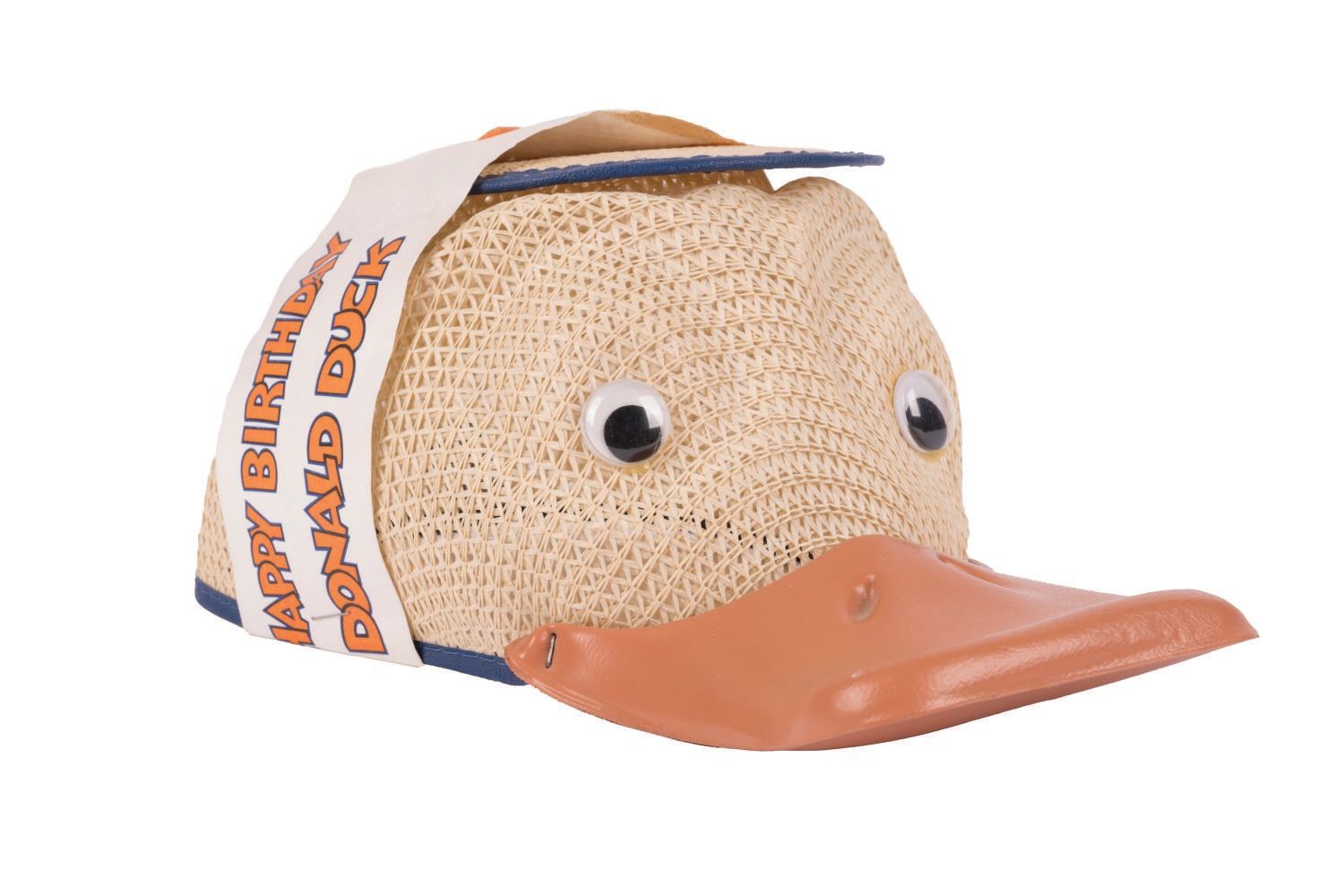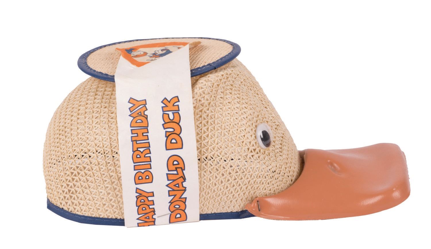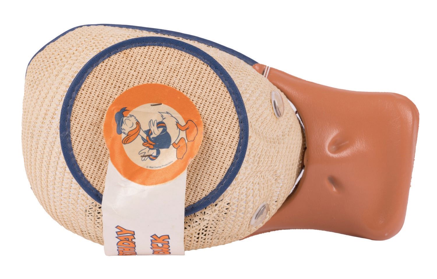 (Disneyland, 1960s) An early Donald Duck child's hat with working squeaker in its bill. The original 1960s Happy Birthday Donald Duck celebratory ribbon is still adhered to the top. The hat is marked as a child's "Large" inside and is in very good condition with yellowing to straw wicker material, slight crushing to crown and minor wear from handling.