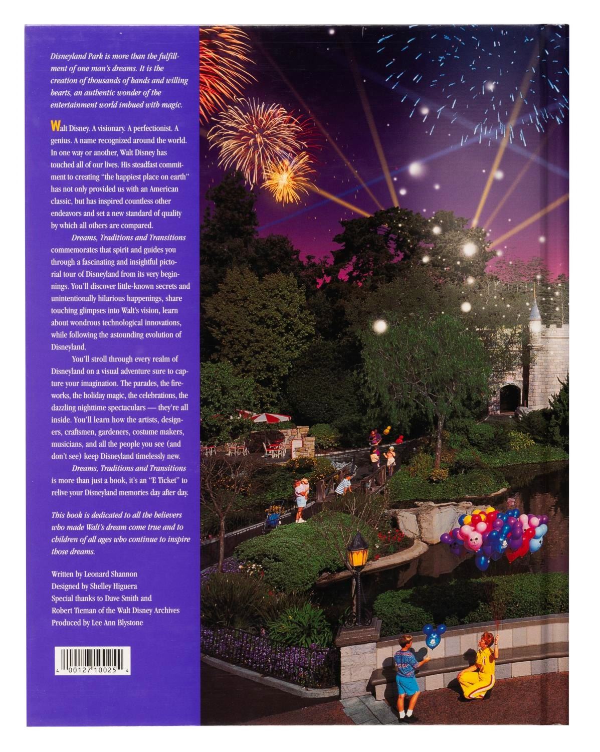 (Kingdom Editions, 2000) A hardcover copy of Disneyland: Dreams, Traditions, and Transitions written by Leonard Shannon. This 176-page book traces the history of the Park with beautiful color photographs. Measuring 8.75" x 11.25", this book is in very good to fine condition with a 1" minor scuff in the top left corner of the cover and a typical light crease in the spine from use.