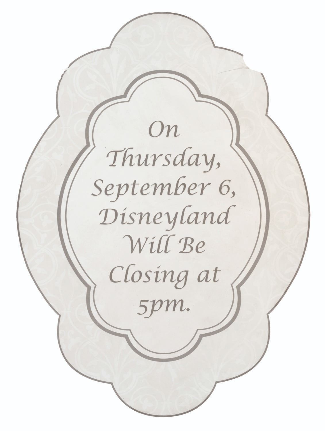 (Disneyland, 2012) A Disneyland early closure sign from Thursday, September 6, 2012. The Park closed early that day for a special Cast Member recognition event. Measuring 16" x 22", the sign is in good condition with typical scratches, scuffs, and wear from Park display, a 2.5" crack, and a 0.5" x 1.5" section missing at the top right.