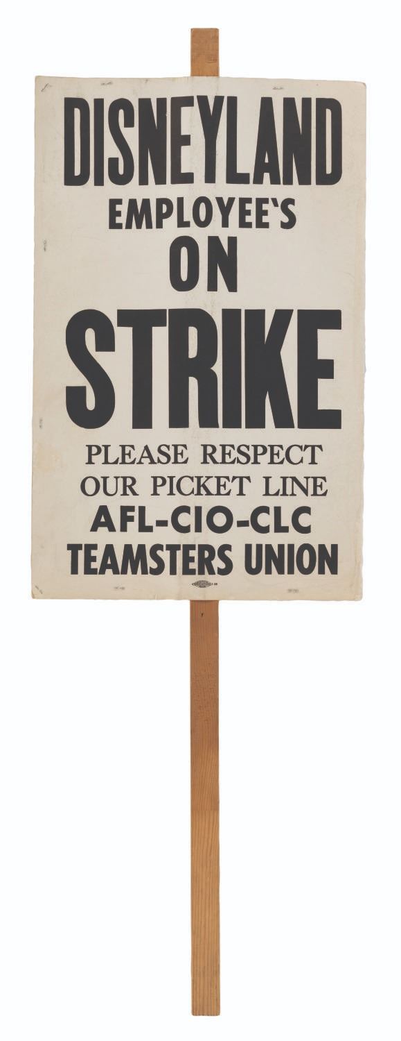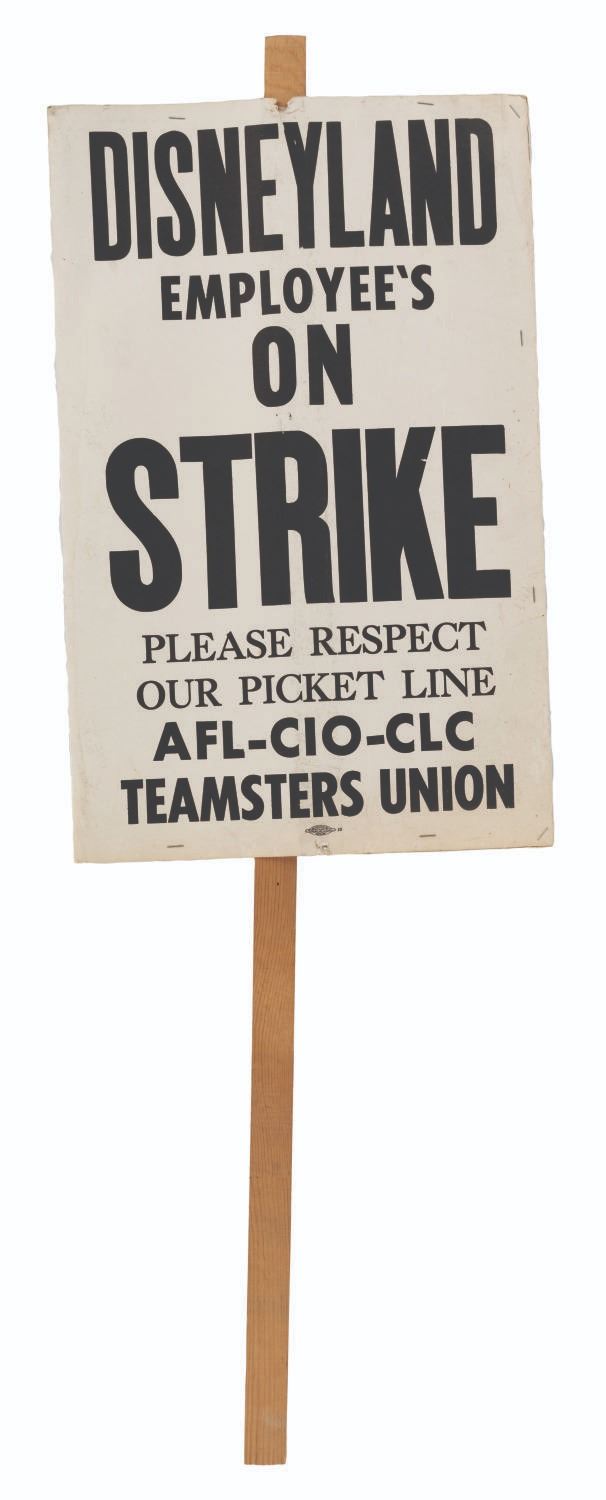 (Disneyland, 1984) A picket sign from the historic Teamsters Union Strike of Disneyland in 1984. This sign was created and used by some of the 1,800 picketers facing a wage freeze, who went on strike for 22 days until an agreement was reached. Measuring 22” x 14” on a 42” stick, the sign is in very good condition, with scuffs, spots of discoloration, and wear from original use.