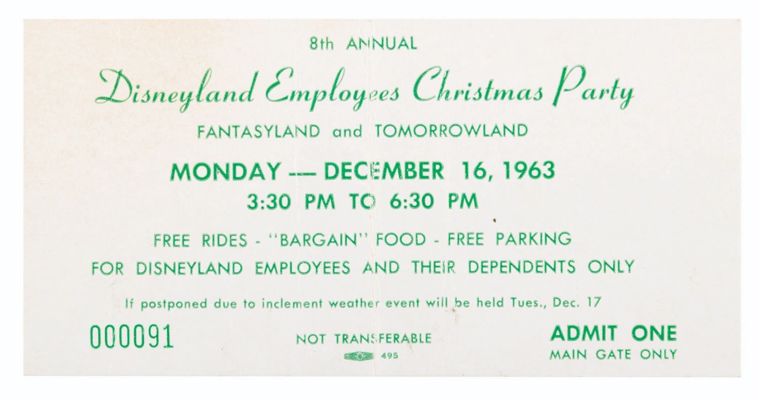 (Disneyland, 1963) A ticket to the 8th Annual Disneyland Employees Christmas Party. The event was held on December 16th, 1963, and offered free rides, "bargain food," and free parking for attendees. Measuring 2.5" x 5", the ticket displays in good condition with creases, edge wear, and a fold down the center.