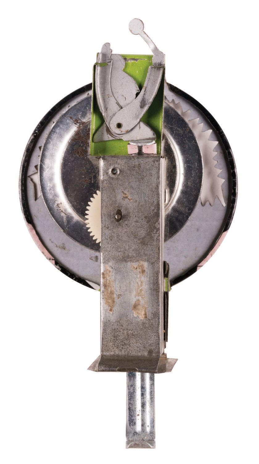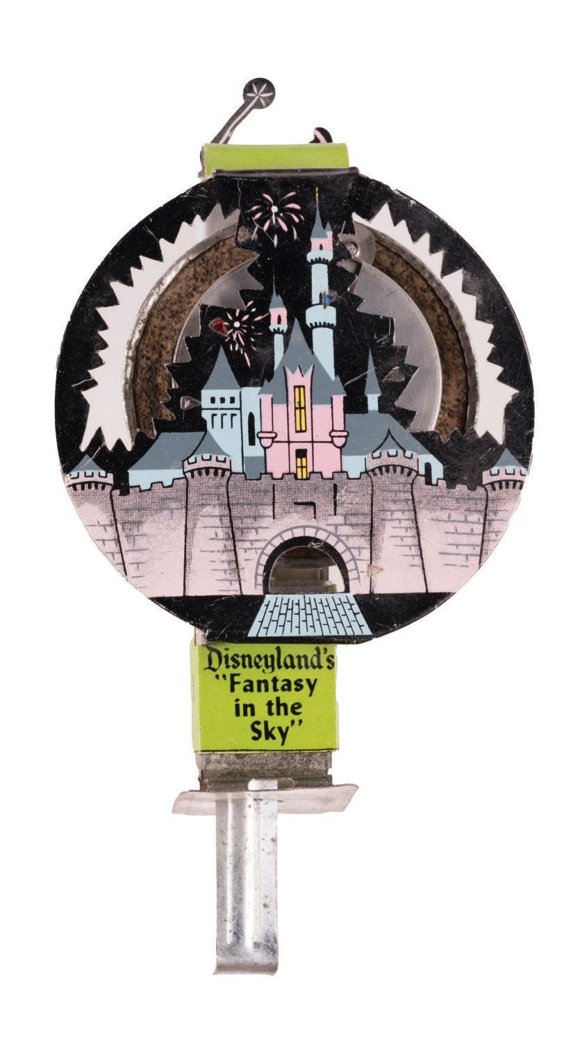 (Disneyland, 1950s) A souvenir sparkler toy commemorating Disneyland's fantasy in the Sky" fireworks spectacular. This souvenir features an animated Tinker Bell raising her wand over Sleeping Beauty Castle Measuring 5.75" tall, the tin lithographic friction toy is in good condition working overall with minor scuffs and wear from handling and age.