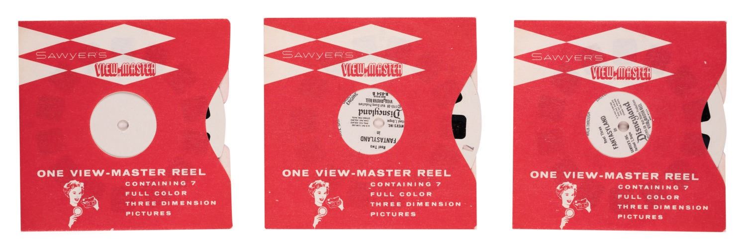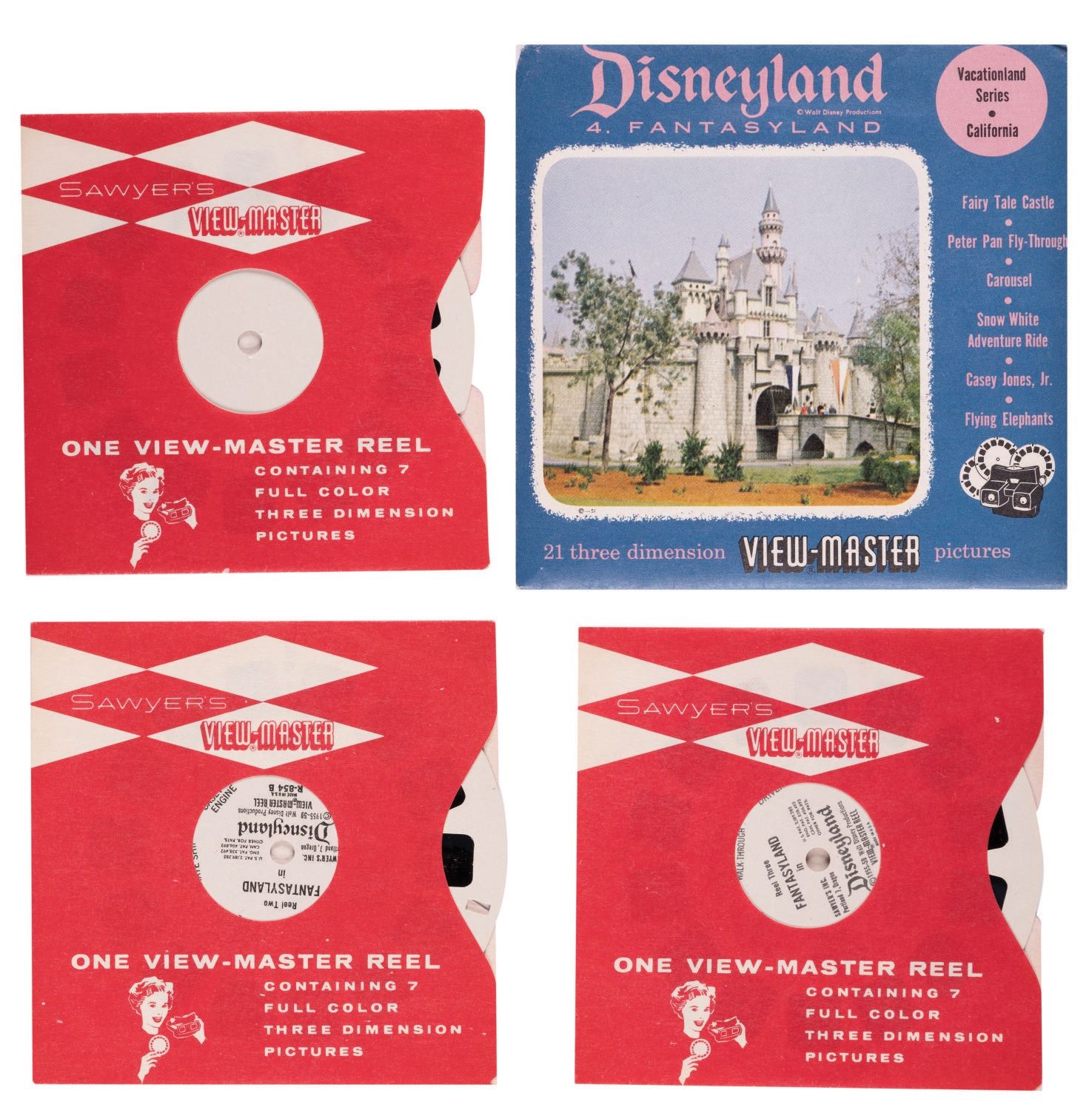 (Disneyland, 1950s-60s) A set of (3) Disneyland Fantasyland View-Master Slides. The images depict the "Fairy Tale Castle," carousel, "Flying Elephants," and Midget Autopia. The three reels come within their original 4.5"x4.5" sleeve and are in fine as-new condition with little apparent wear from handling or age.