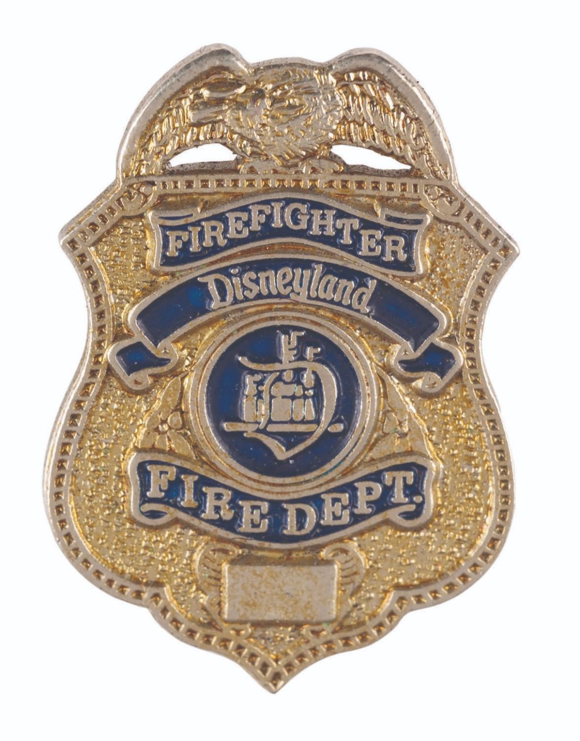 (Disneyland, 1987-99) A Cast exclusive Disneyland Firefighter pin resembling badges worn by the members of the Disneyland Fire Department. These pins were sold to raise money for special events and department gatherings. Measuring 1” x 0.75”, the pin displays in very good condition with light tarnish.