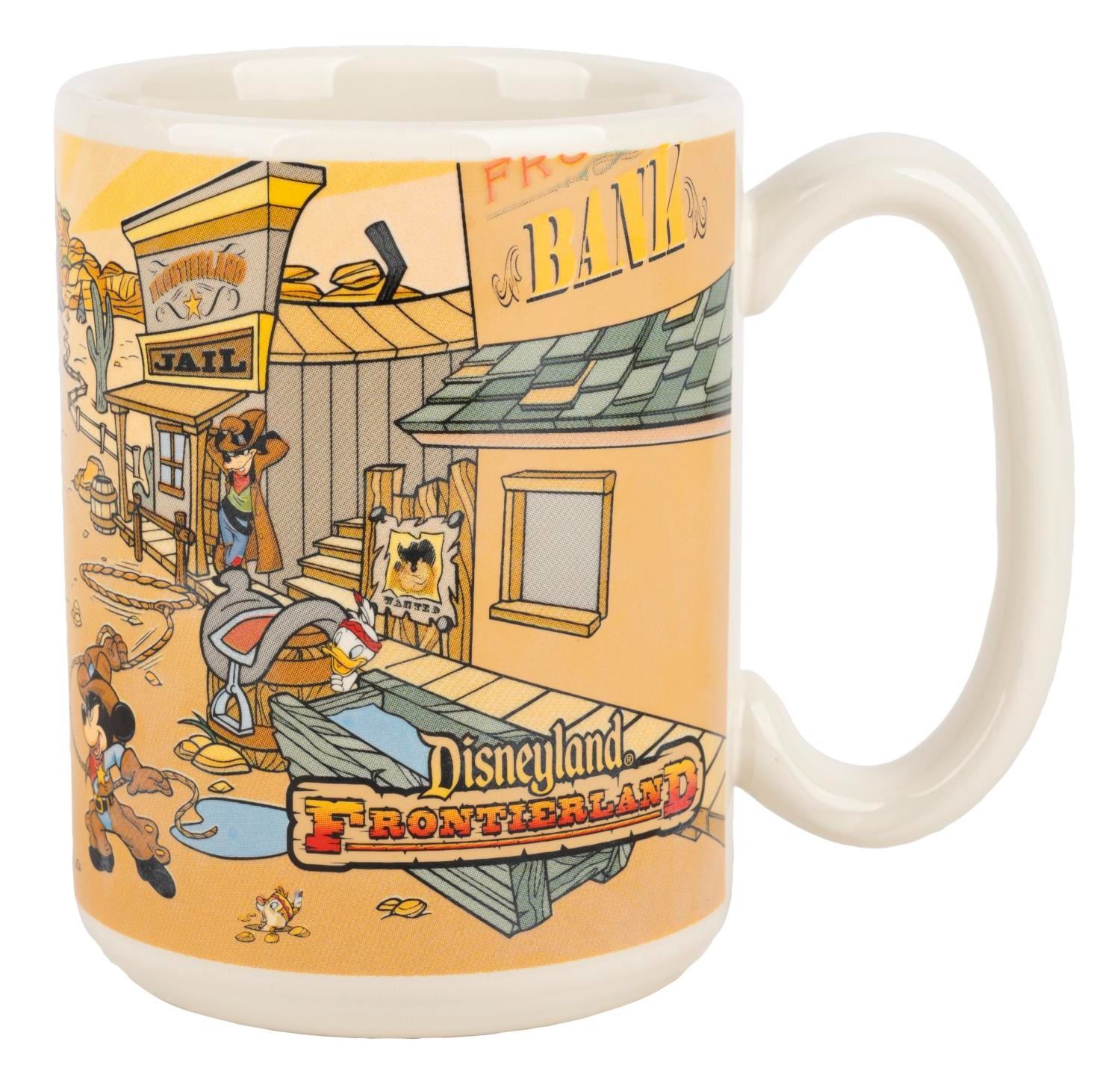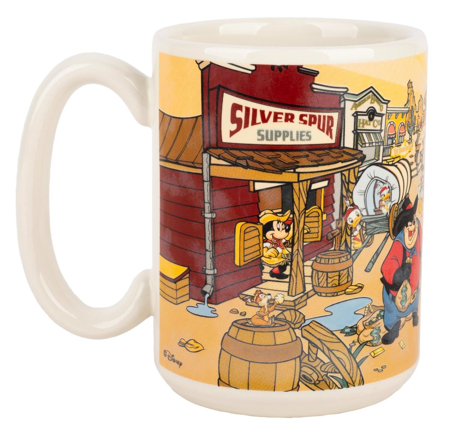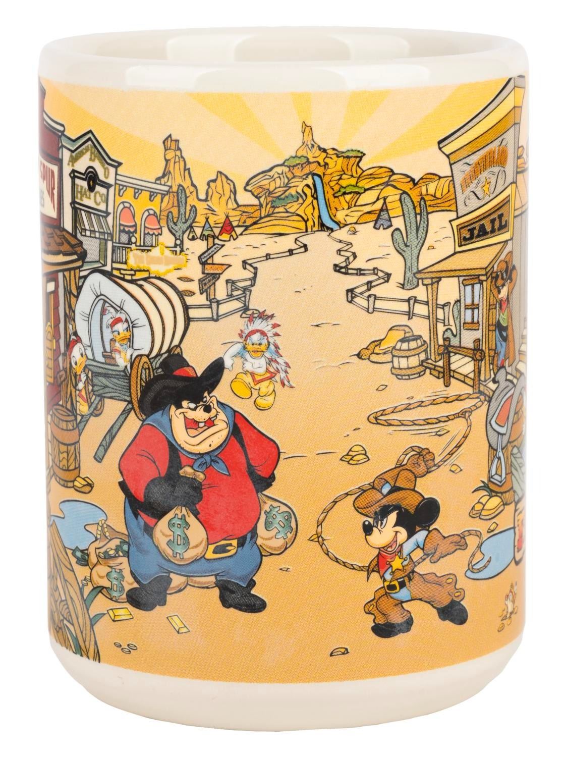 (Disneyland, 1990s-2000s) A souvenir ceramic coffee mug from Frontierland featuring Mickey, Minnie, Pete, Daisy, Donald, and Goofy in Western gear facing off against a bank-robbing Pete. Measuring 3.25” in diameter and 4.5” tall, the mug displays in very good condition with wear and discoloration from age.