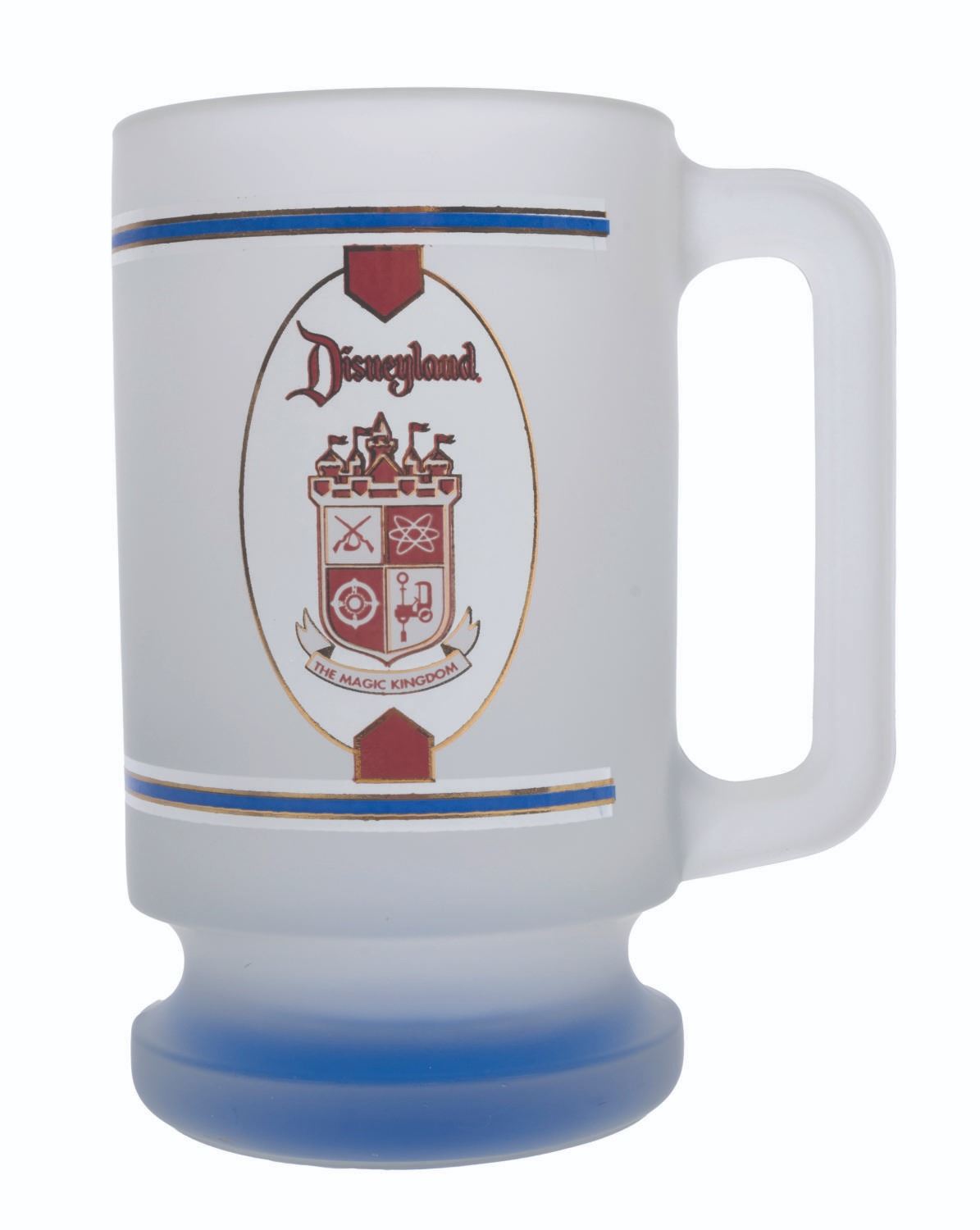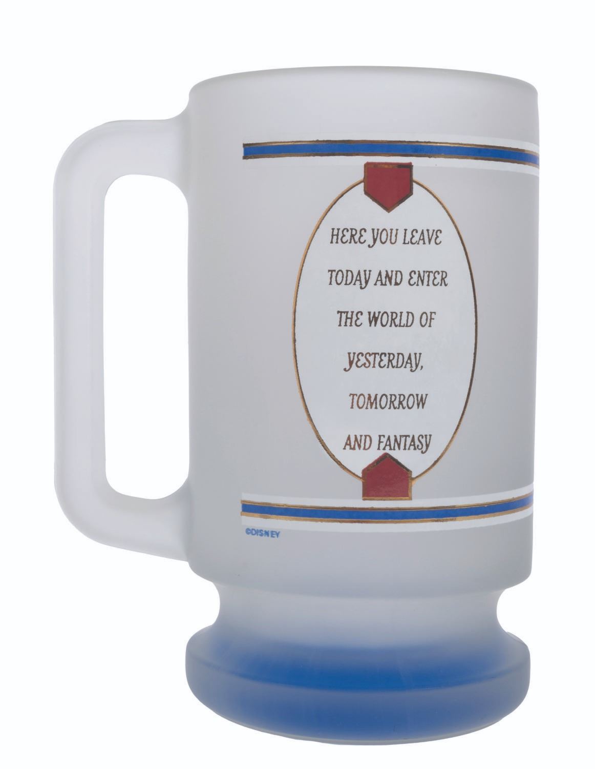 (Disneyland, 1980s-1990s) A frosted glass mug featuring the Disneyland coat of arms and the Walt quote from the Park entrance plaque, "Here you leave today and enter the world of yesterday, tomorrow and fantasy." Measuring 6" tall with a 3.5" diameter, the mug is in very good condition with some smudges and tape residue on the bottom of the base.
