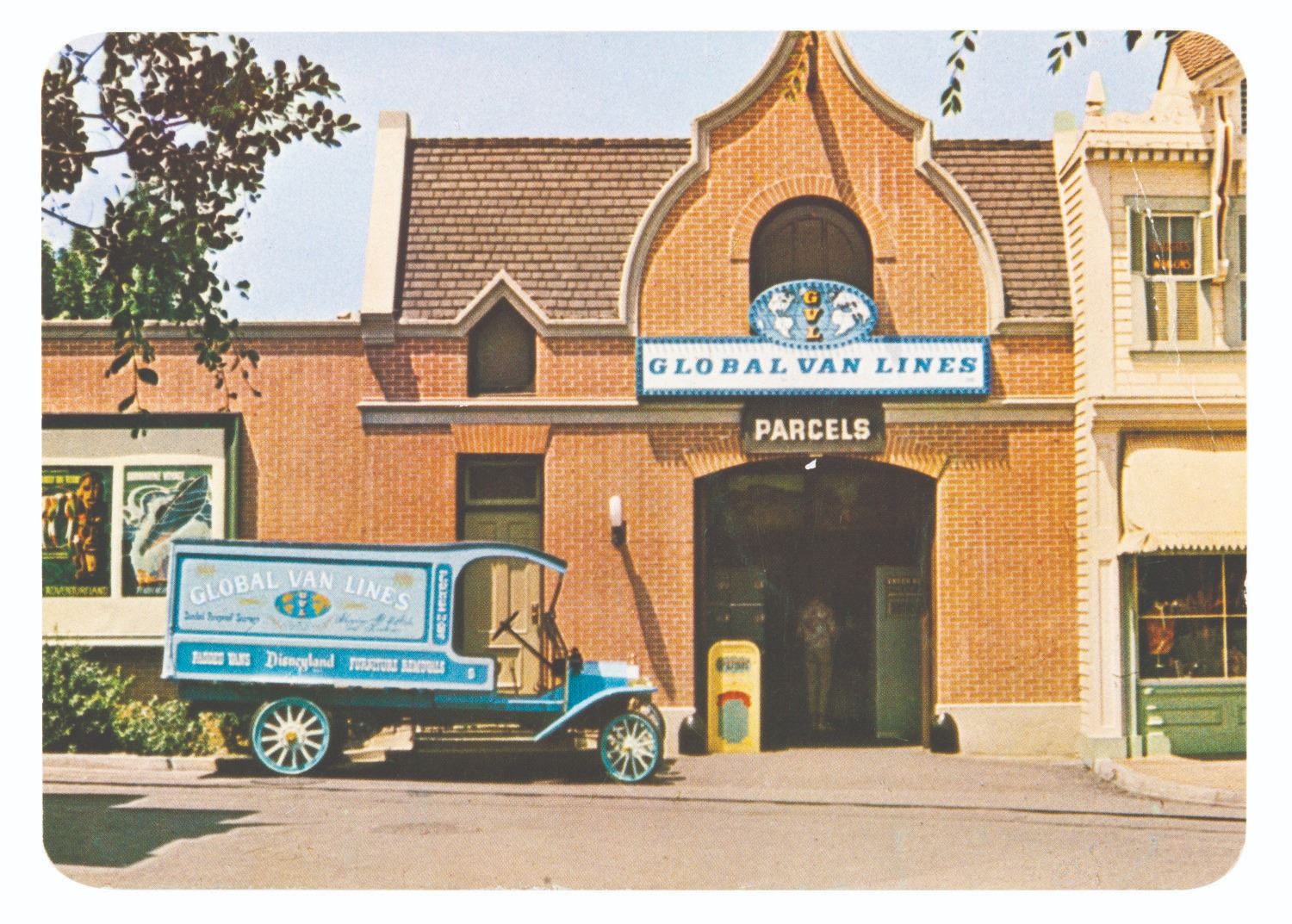 (Disneyland, 1960s) A rare large promotional postcard for Disneyland's Global Van Lines, originally sold at their location within the Park. The card features the building's facade with its iconic 1910 Ford Moving Truck. Measuring 5" x 7", the postcard is in good condition with a crease in the upper right corner and minor edge wear.