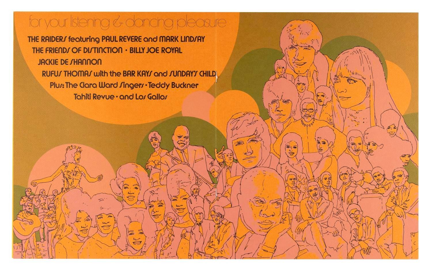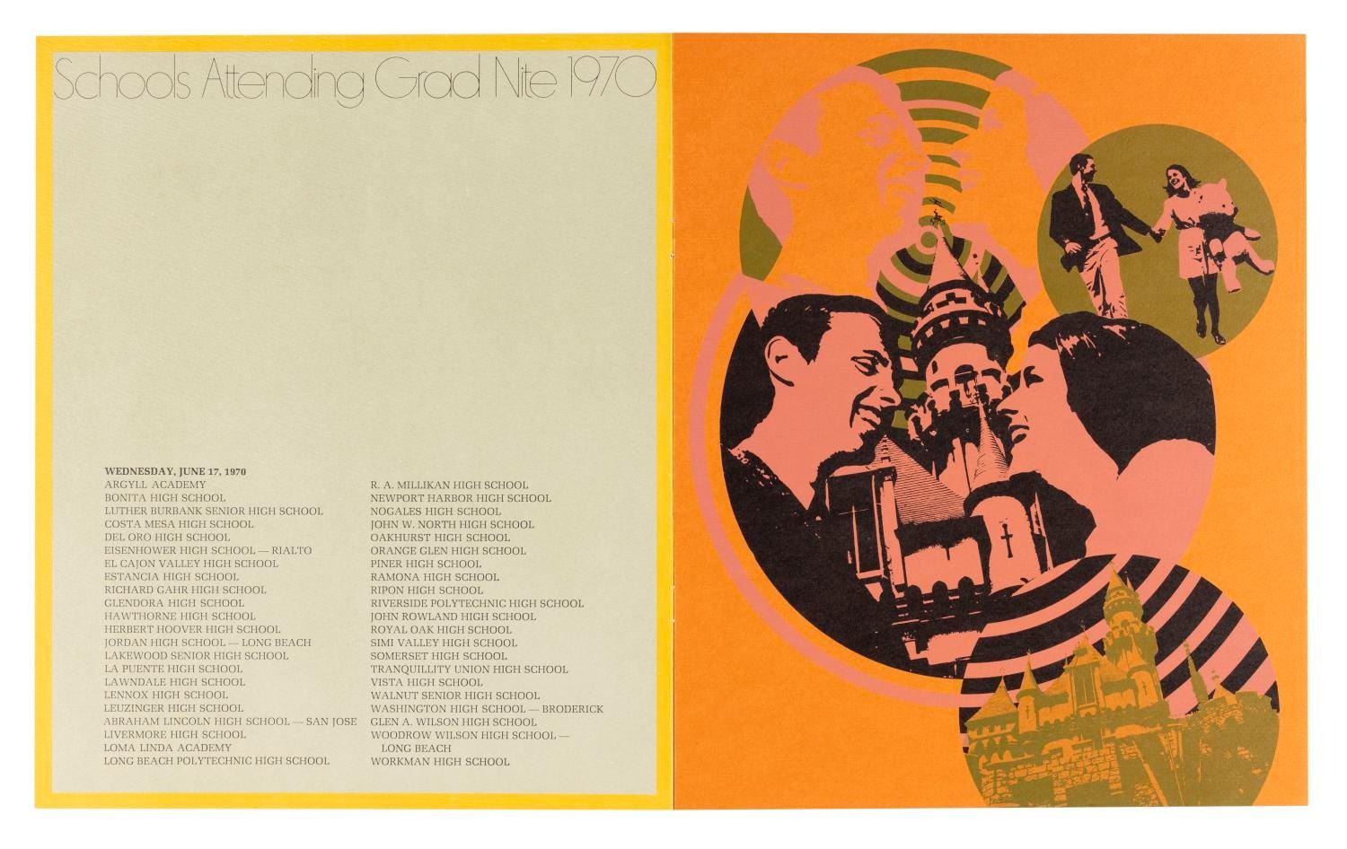 (Disneyland, 1970) A mod souvenir Grad Nite ’70 program featuring the names of the night’s musicians, a list of the schools who attended the event, and a space for autographs. Measuring 8.75” x 10.75”, the unused program is in fine condition.