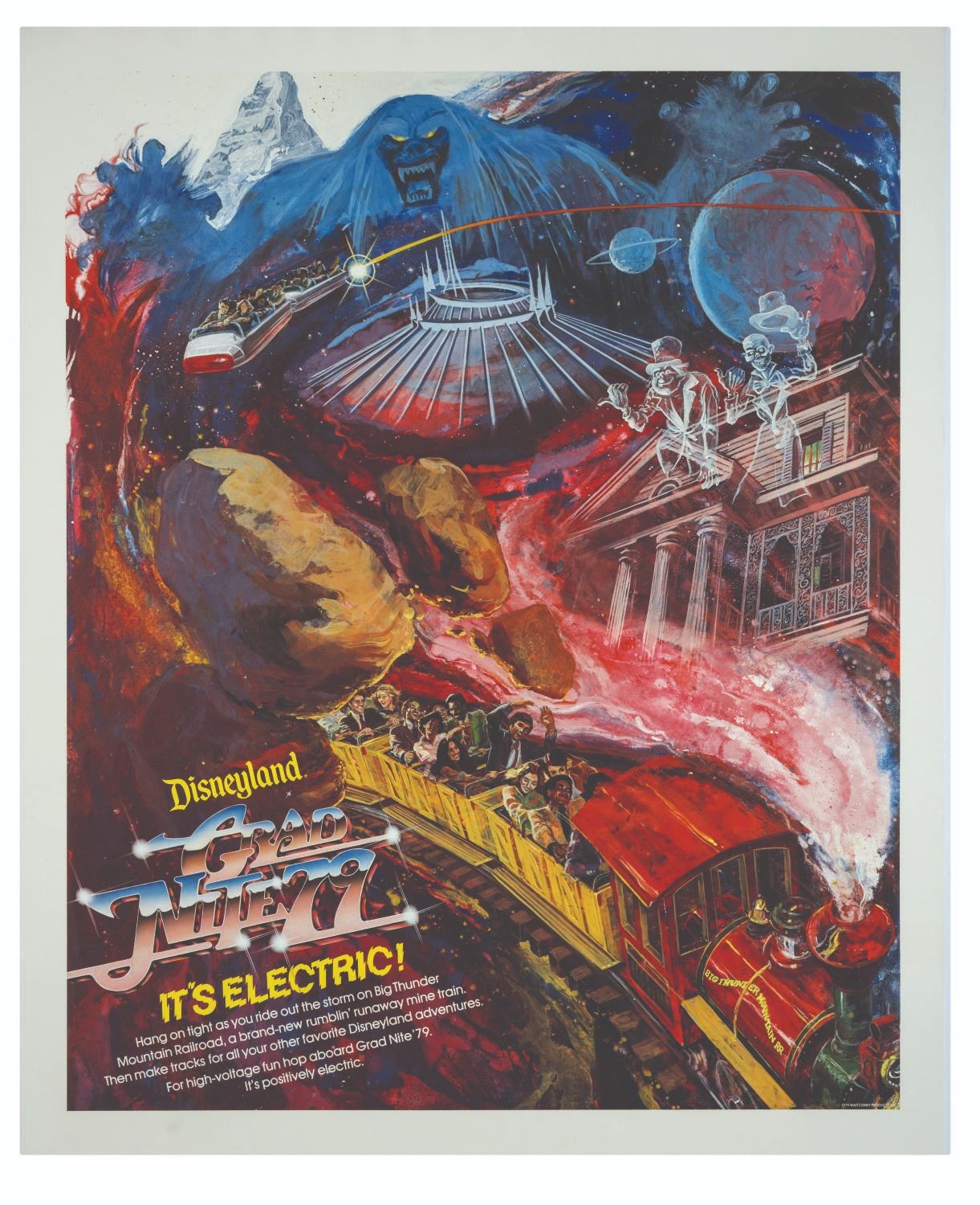 (Disneyland, 1979) A poster promoting Disneyland Grad Nite '79. The artwork highlights the popular attractions Space Mountain, Haunted Mansion and the most recent addition - Big Thunder Mountain Railroad. Measuring 24.5”x30”, the poster is in very good condition, with few minor areas of wear to the edges.