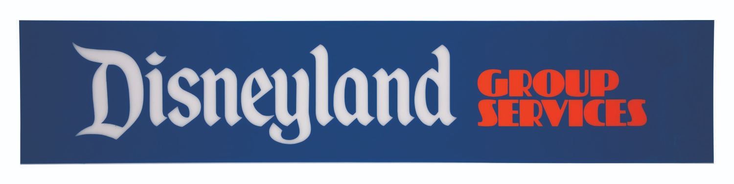 (Disneyland, 1980s) An acrylic sign for Disneyland Group Services. The acrylic sign was meant to be backlit possibly for use with a Main Gate or Main Street kiosk and comes from the collection of Milt Albright (Disneyland Special Projects). Measuring 47"x9.75”, the sign exhibits light wear and is in very good, used condition.