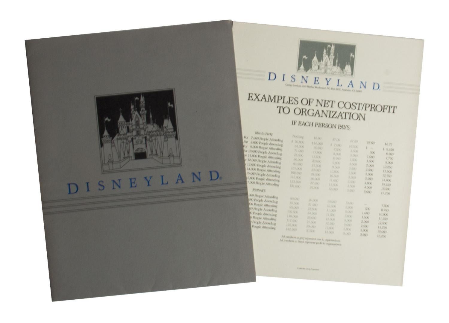 (Disneyland, 1984) A Disneyland Group Services department packet for businesses and organizations, including information on group sales tickets and special offerings. It also features a booklet promoting group events at the Park, a Party Information Sheet with four group options, and a Cost/Profit analysis sheet. The outer folder measures 11.5" x 9" and the packet is in very good condition.
