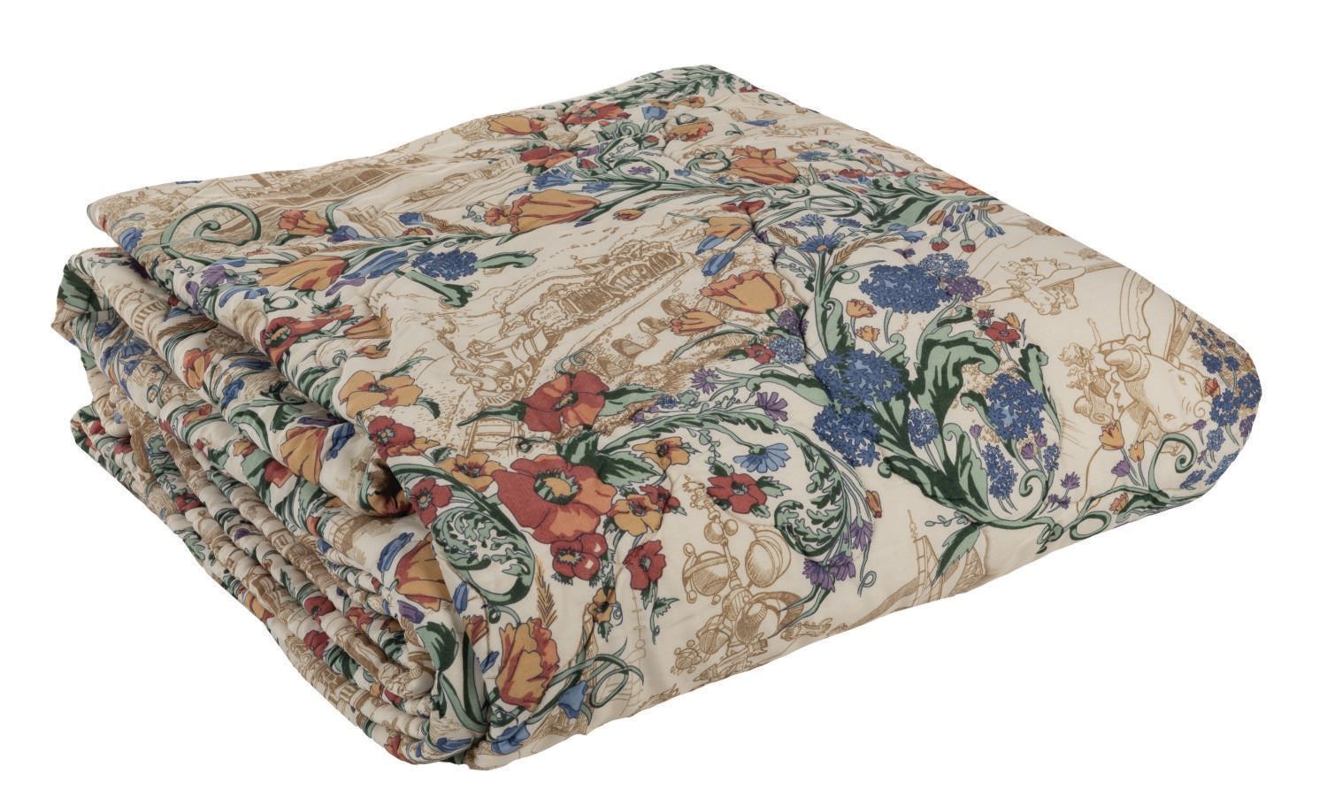 (Disneyland Hotel, 2000s) A queen-size bedspread used at the Disneyland Hotel. The bedspread features a bold floral print with understated sepia-tone illustrations of iconic Disneyland attractions in the background including the Haunted Mansion and Pirates of the Caribbean. The condition is very good overall, with very minor wear from hotel use.