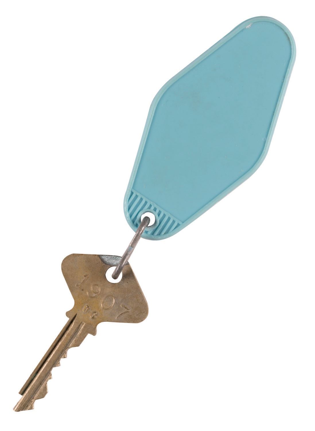(Disneyland Hotel, 1960s) A key and blue keychain fob from The Disneyland Hotel. Keys of this sort were used by Guests of the Hotel until the Sierra Tower was added in 1966. The fob measures 2.5"x1.5" while the YALE key is 2.5" long. Each is in very good condition with minor wear scuffs and wear from use.