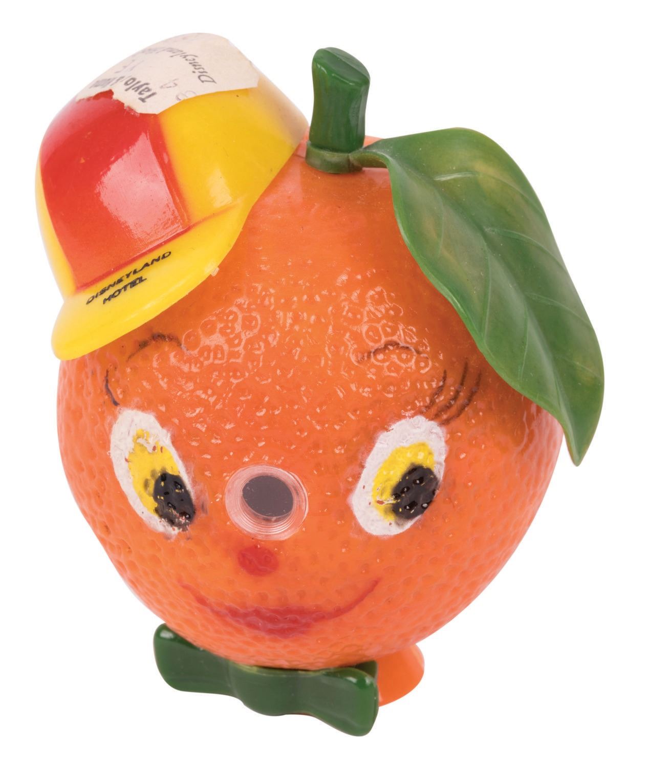 (Disneyland Hotel, 1960s-70s) A Disneyland Hotel Orange Picture Viewer. The plastic picture viewer contains vintage scenes of Disneyland and Disneyland Hotel attractions like the Lobby, Olympic Size Pool, and Marina Tower. The souvenir notably retains its Taylor & Hume price label sticker on its hat. Measuring 3" tall and 2.75" in diameter, the novelty item is in very good condition, despite loosening of the hat and minor color fading to slides.