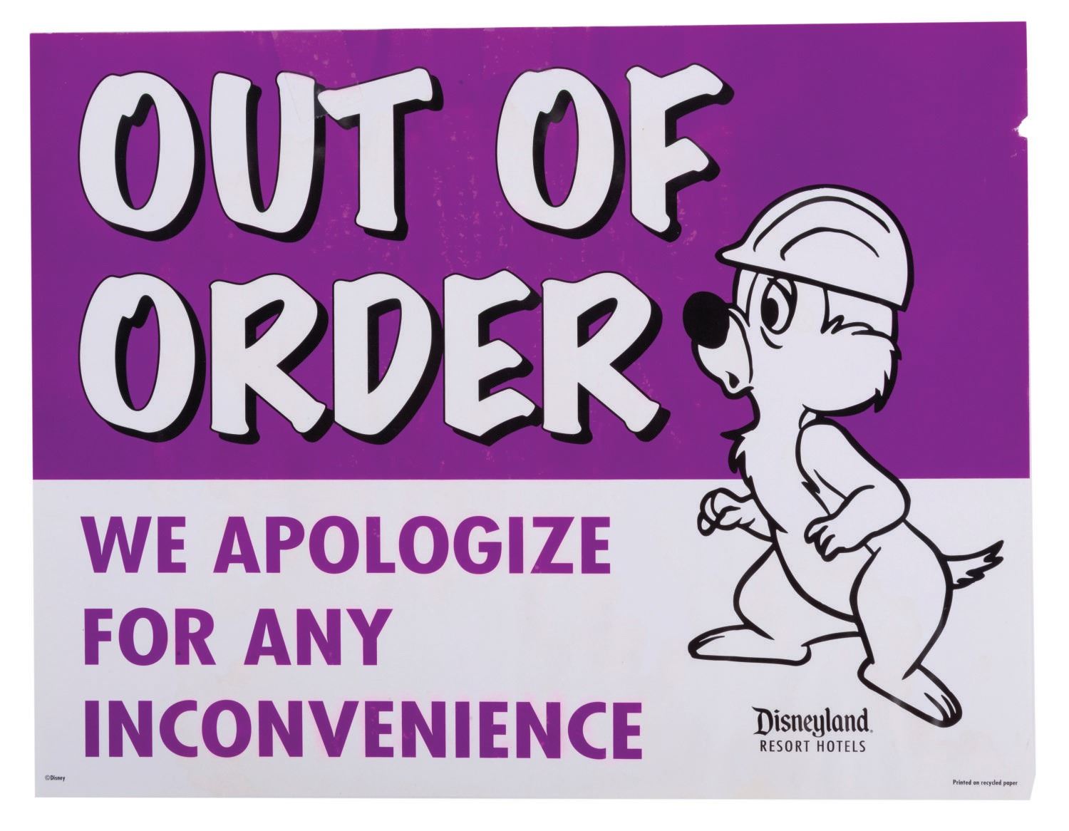 (Disneyland Hotel, 2000s) An "Out of Order" sign from the Disneyland Hotel Resorts. The sign features Dale the chipmunk. Measuring 11"x8.75", the paper sign is in good condition with color fading, a taped tear, and wear to edges and throughout from display and handling.