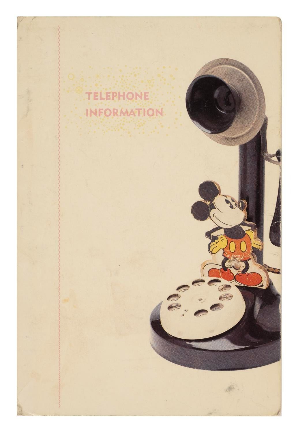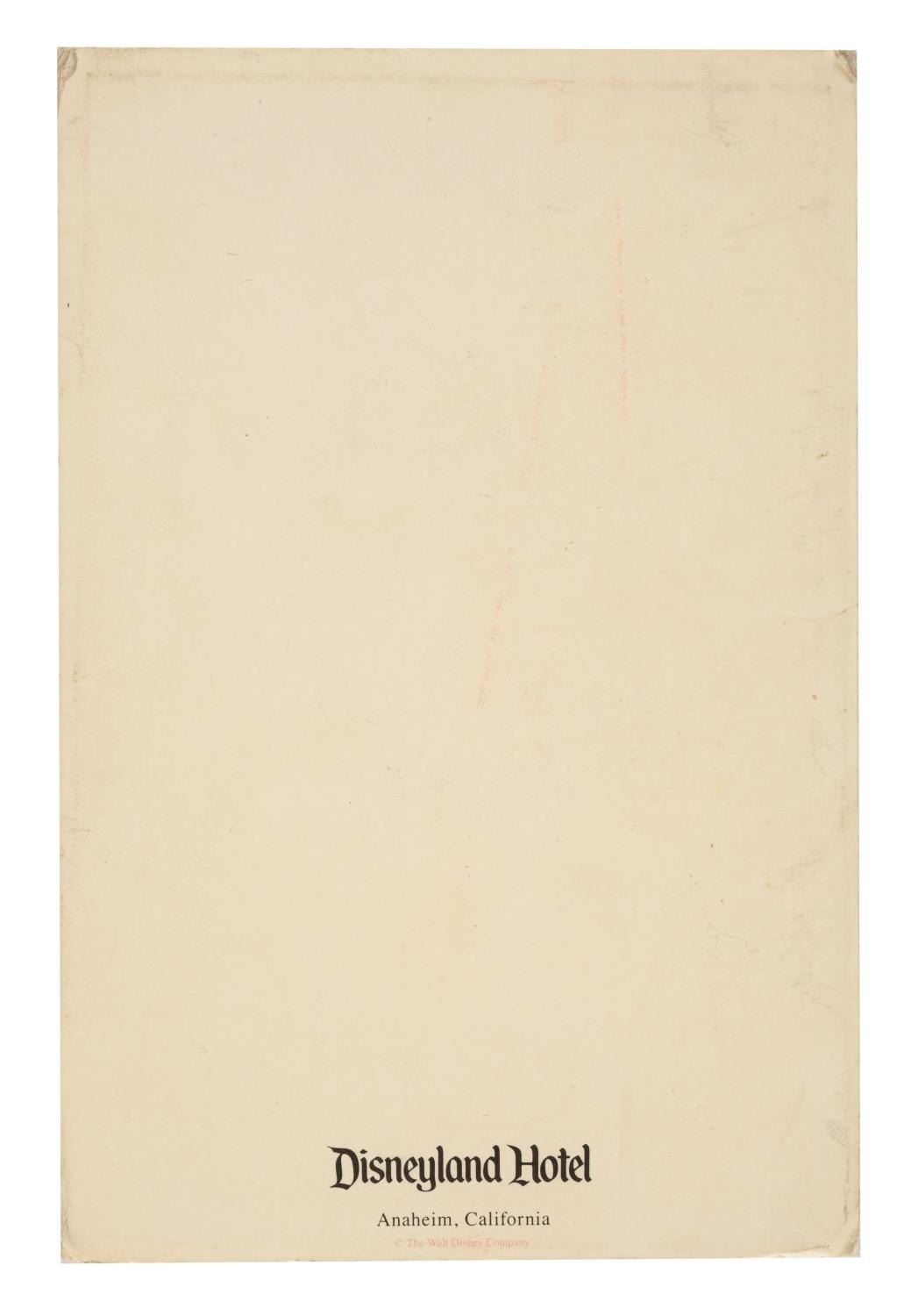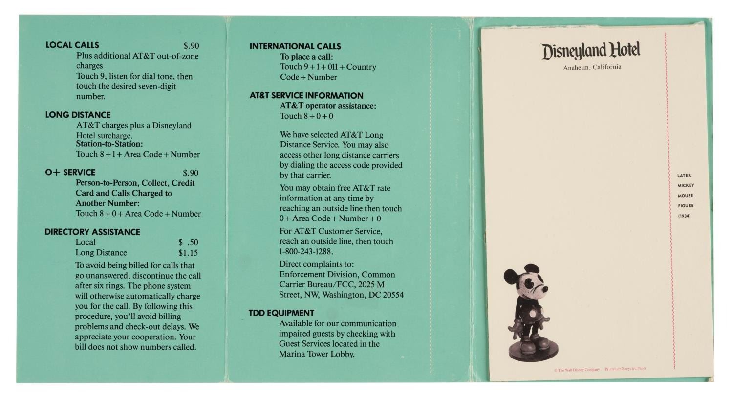 (Disneyland Hotel, 1980s-90s) A Disneyland Hotel telephone information notepad and directory. Measuring 4” x 6”, the item displays in good condition with spotting, stains, creases, wear, and some notepad pages missing.