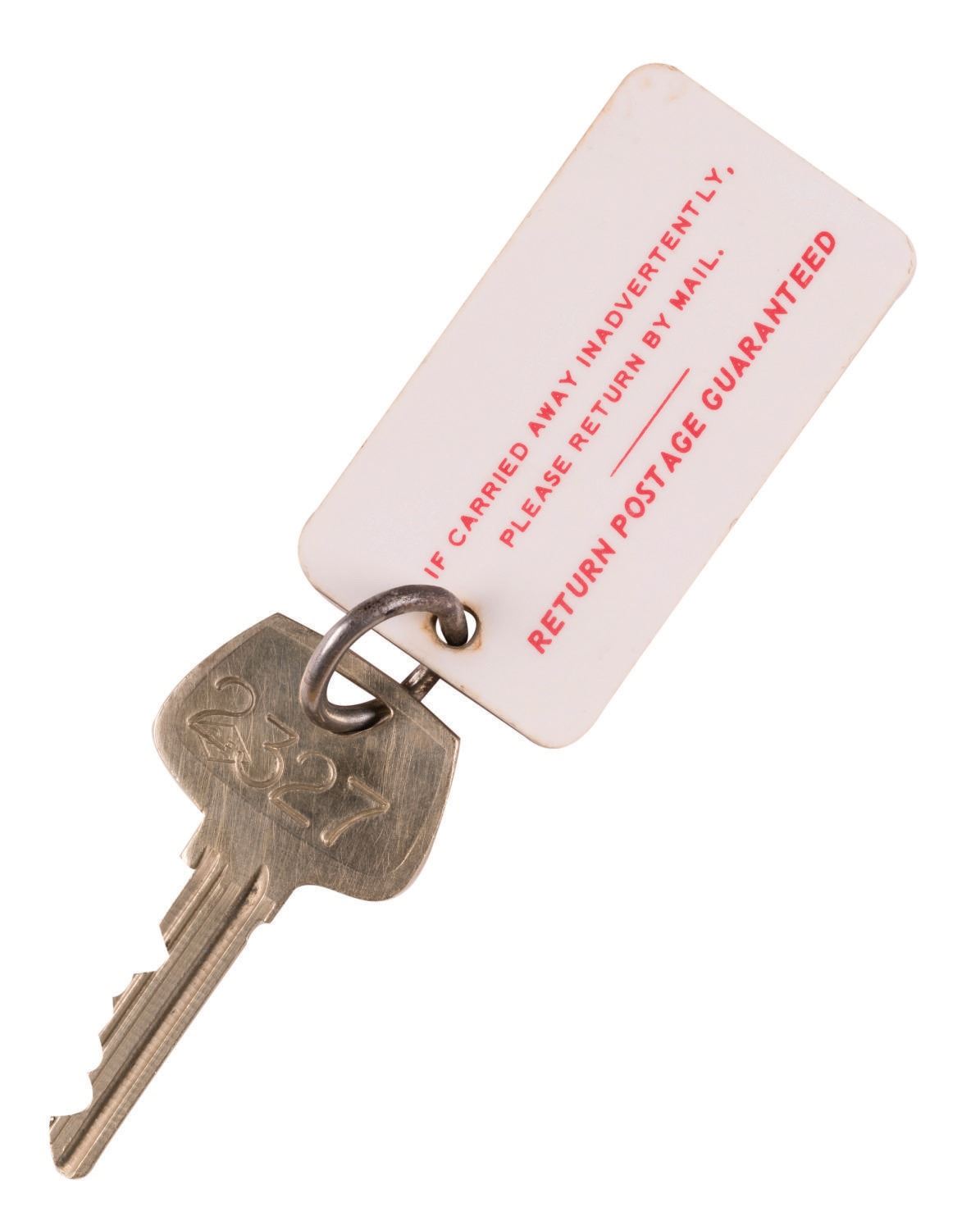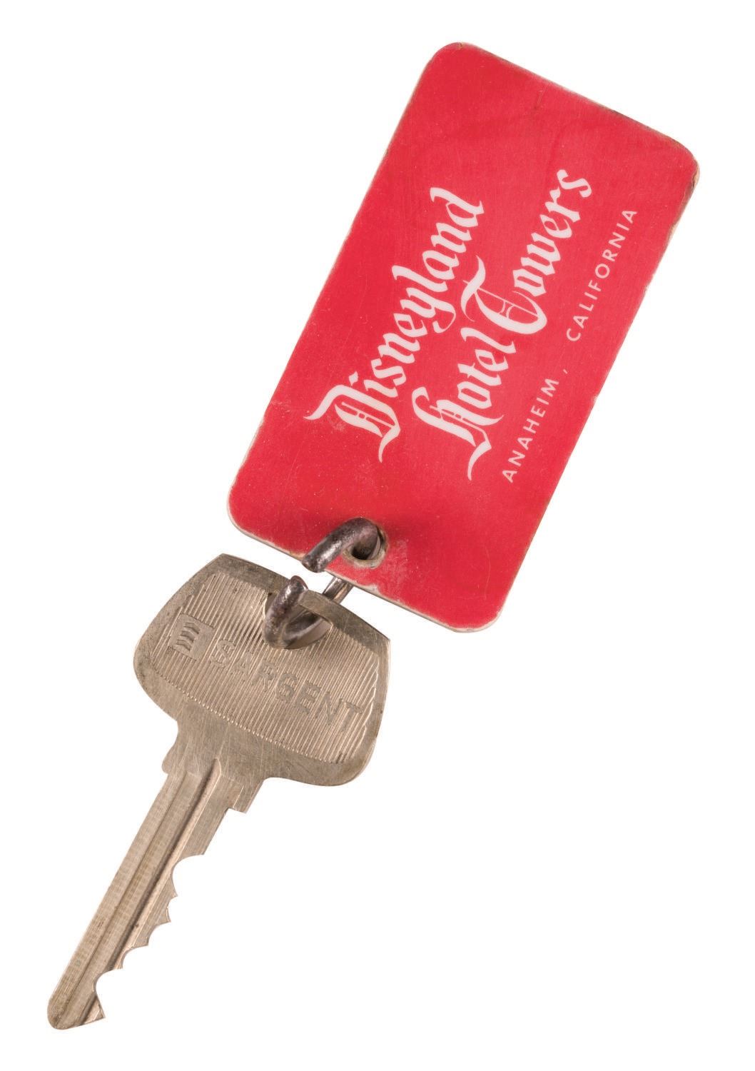 (Disneyland Hotel, 1960s-70s) A key and red keychain fob from The Disneyland Hotel Towers. The first Disneyland Hotel Tower was constructed in 1961, while the Sierra Tower was added in 1966. The fob measures 2.5"x1.5" while the Sargeant brand key is 2.5" long. Each is in very good condition with minor wear scuffs and wear from use.