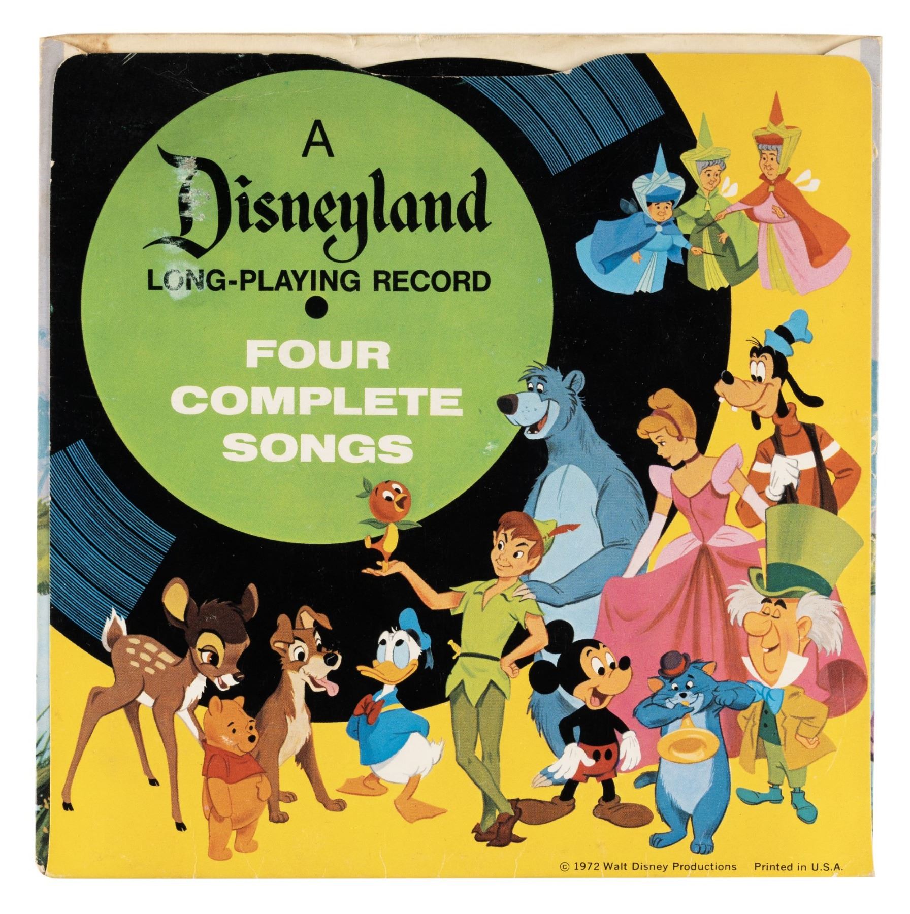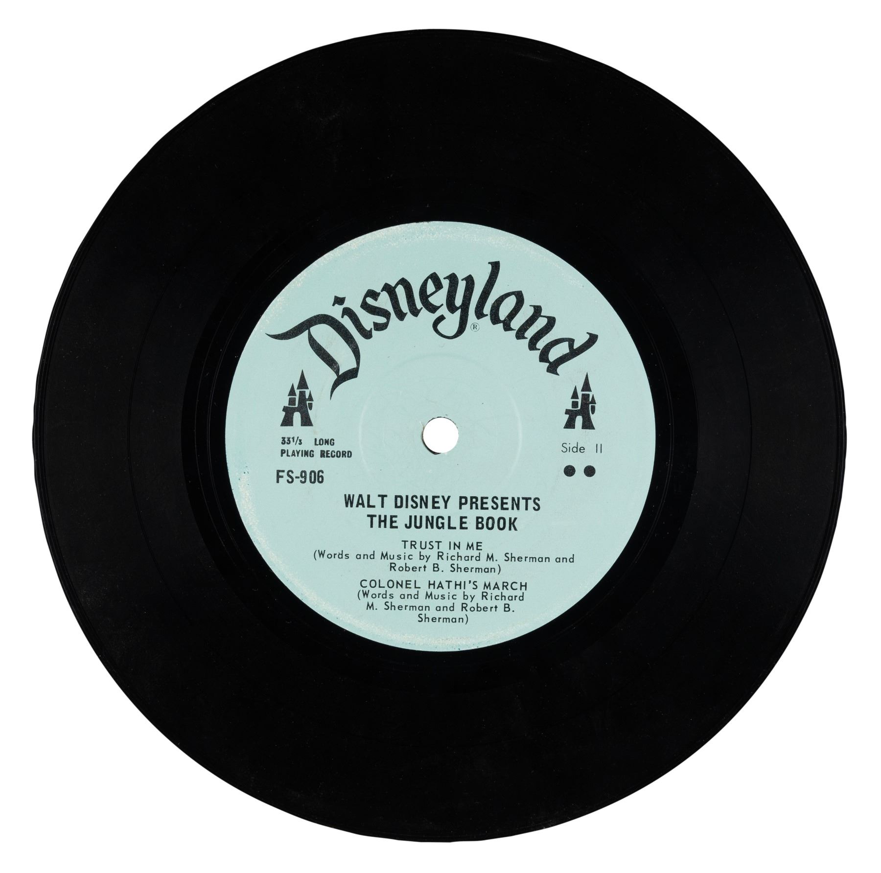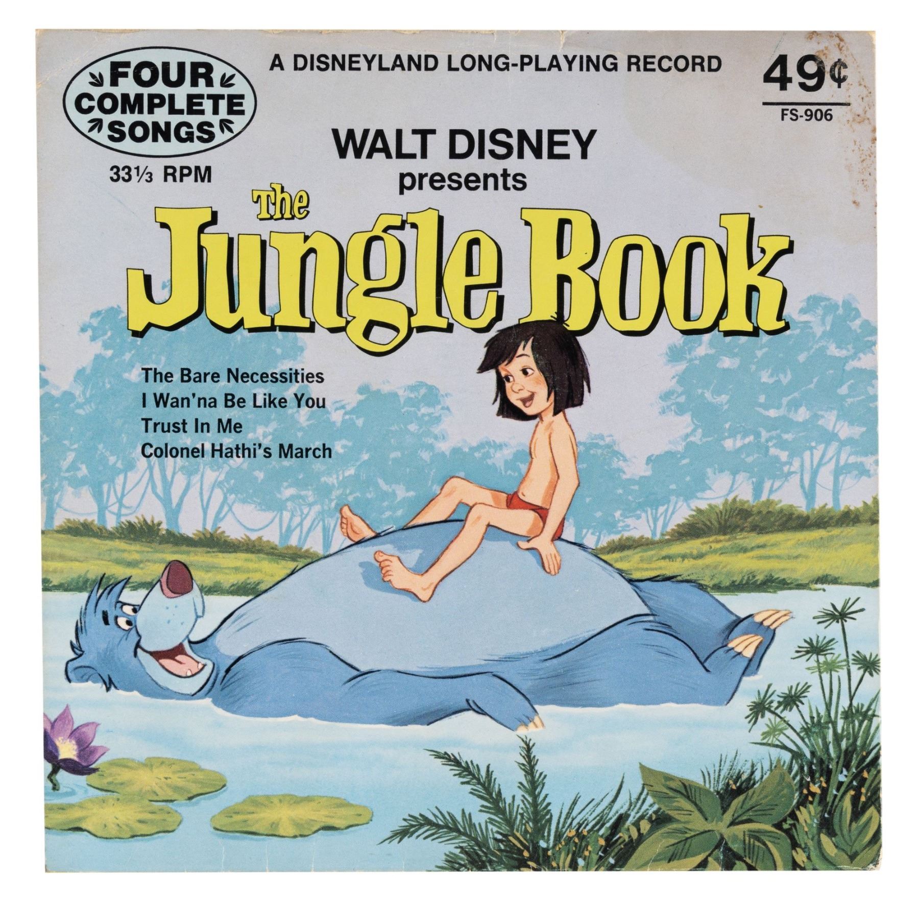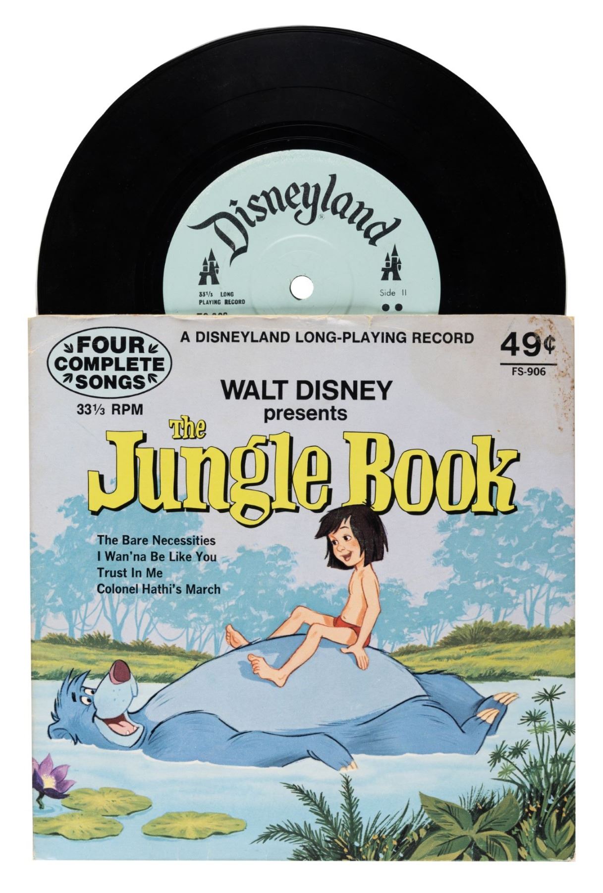 (Disney, 1972) A Disneyland Record featuring four songs from"The Jungle Book." Included are"The Bare Necessities,""I Wan'na Be Like You,""Trust in Me," and"Colonel Hathi's March." The 6.75" record and sleeve are in good condition with wear from use, including a split edge and soiling to one corner of the sleeve.