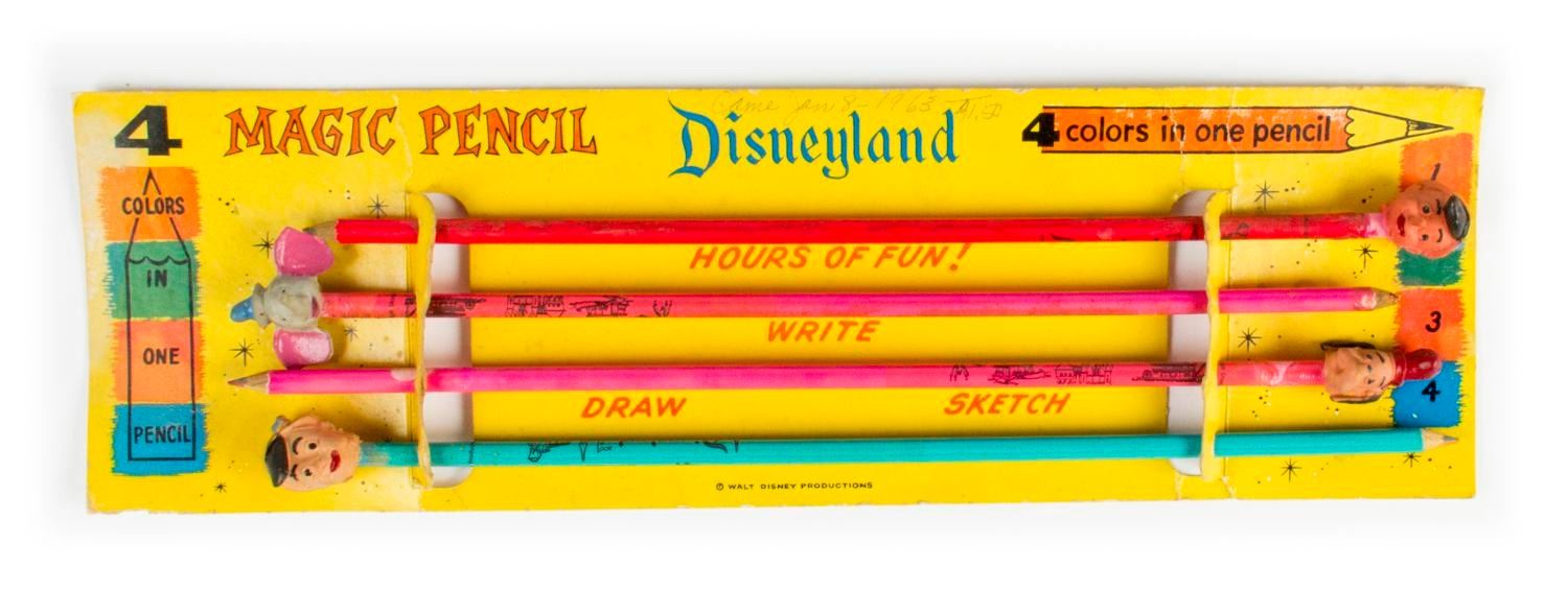 (Disneyland, 1963) A large pencil set from Disneyland featuring four color-changing pencils based on Disney characters. The pencils come on their original card backing, and some notes written along the edge indicate the pencils were purchased in 1963. The pencil set measures 5.25" x 17.5" and is in fair to good condition with some wear throughout.