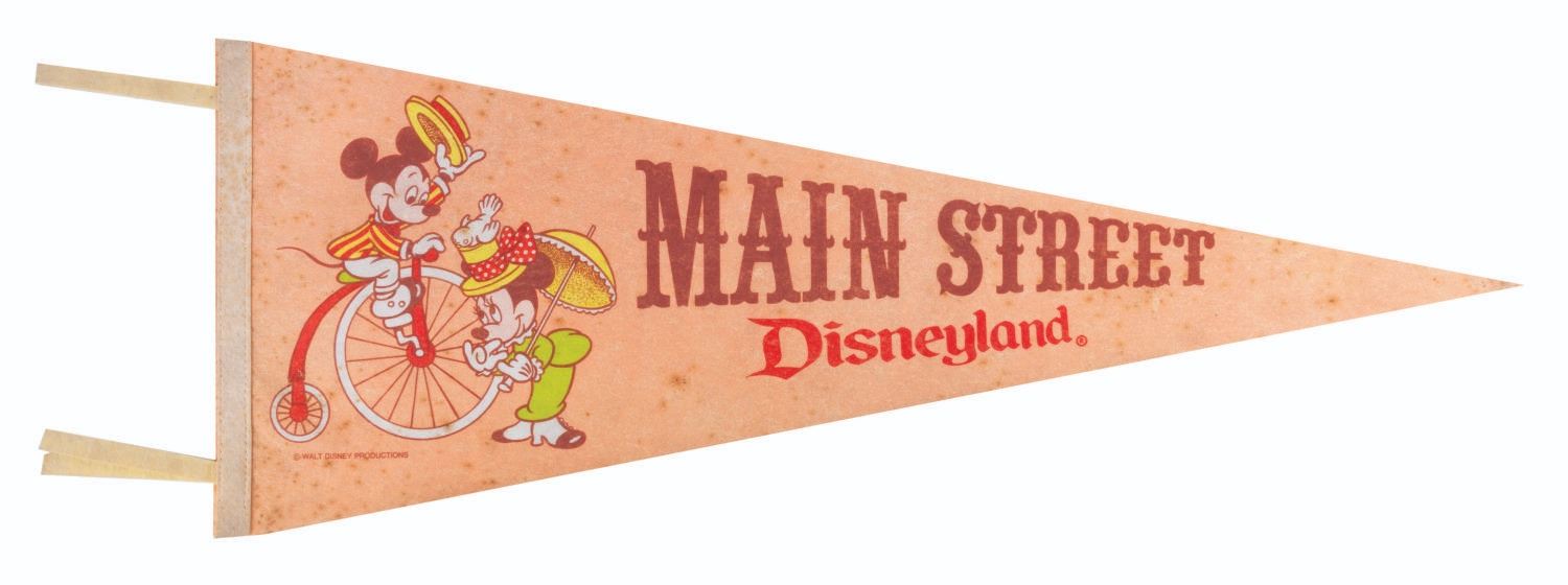 (Disneyland, 1980s) A souvenir Main Street, U.S.A. pennant from Disneyland featuring Mickey and Minnie Mouse in turn-of-the-20th-century attire. Measuring 11.25" x 33.5", the felt pennant is in fair condition with heavy stains and pinholes.