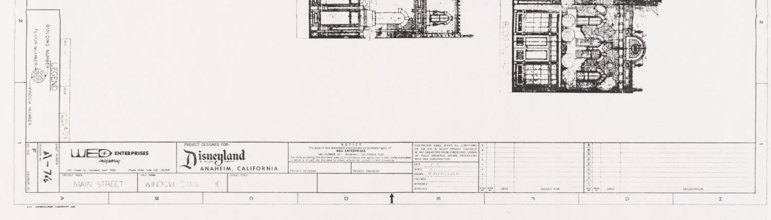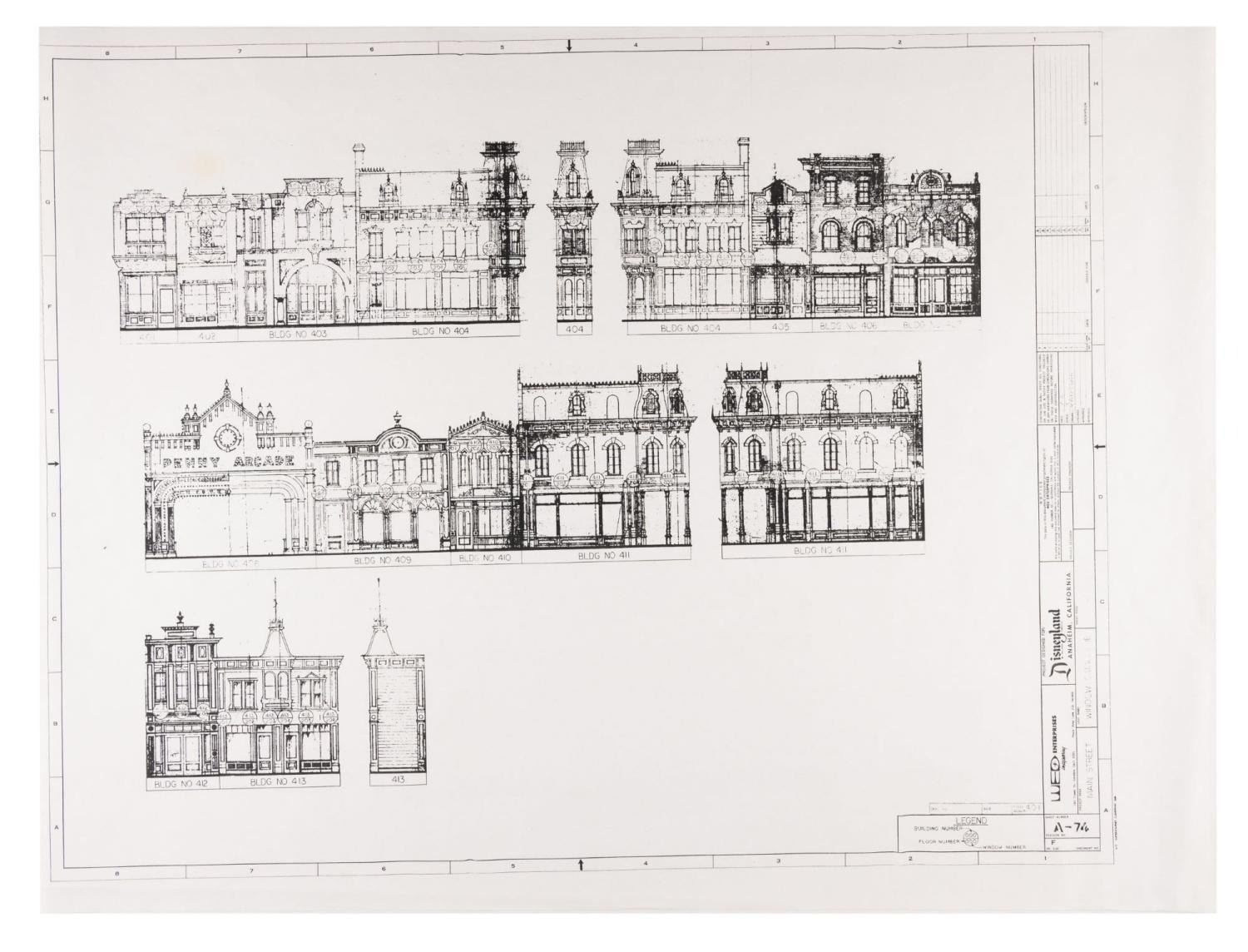 (WDI, 1980s) A xerox of a Walt Disney Imagineering blueprint for Main Street, U.S.A. at Disneyland. Measuring 18” x 24”, the xerox displays in very good condition with creases, edge wear, and stains at the top left.