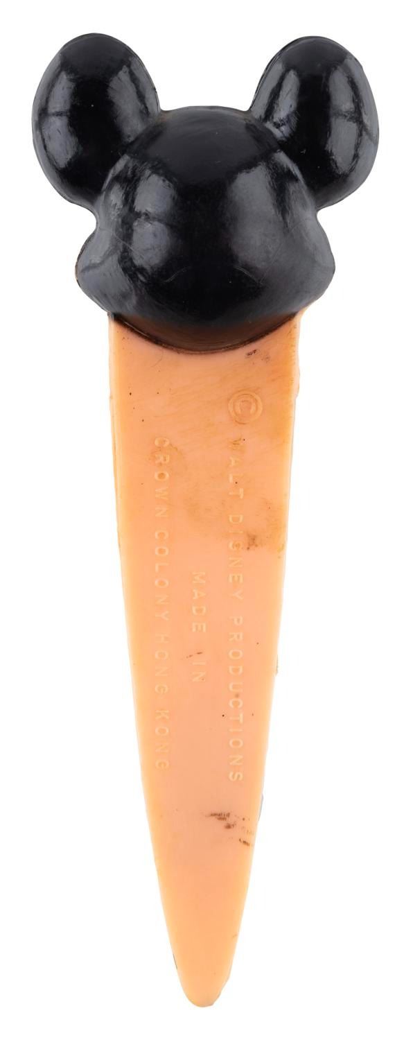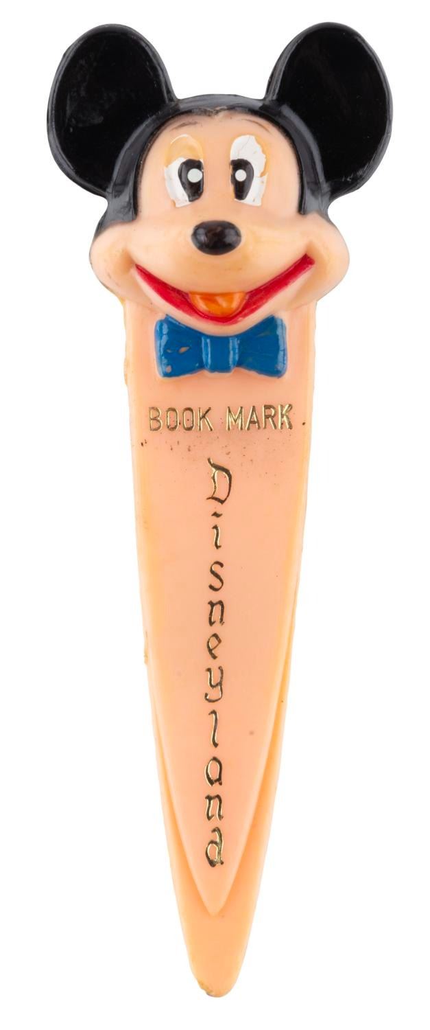 (Disneyland, 1950s-60s) A plastic Disneyland bookmark with a figural Mickey head. Measuring 5" long, the bookmark displays in good condition with paint loss, scratches, soiling, and wear from age.