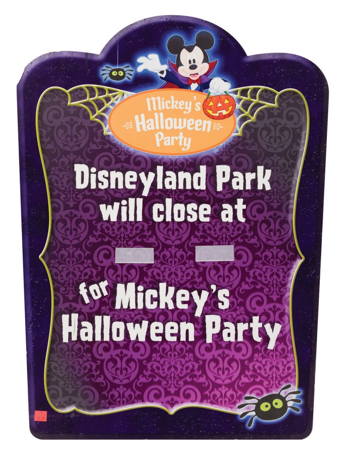 (Disneyland, 2010s) A sign for Mickey's Halloween Party at Disneyland. The sign informed Guests of Park closing hours. Printed on PVC board, the single-sided sign measures 27.25"x18" and is in good condition with minor surface wear throughout.