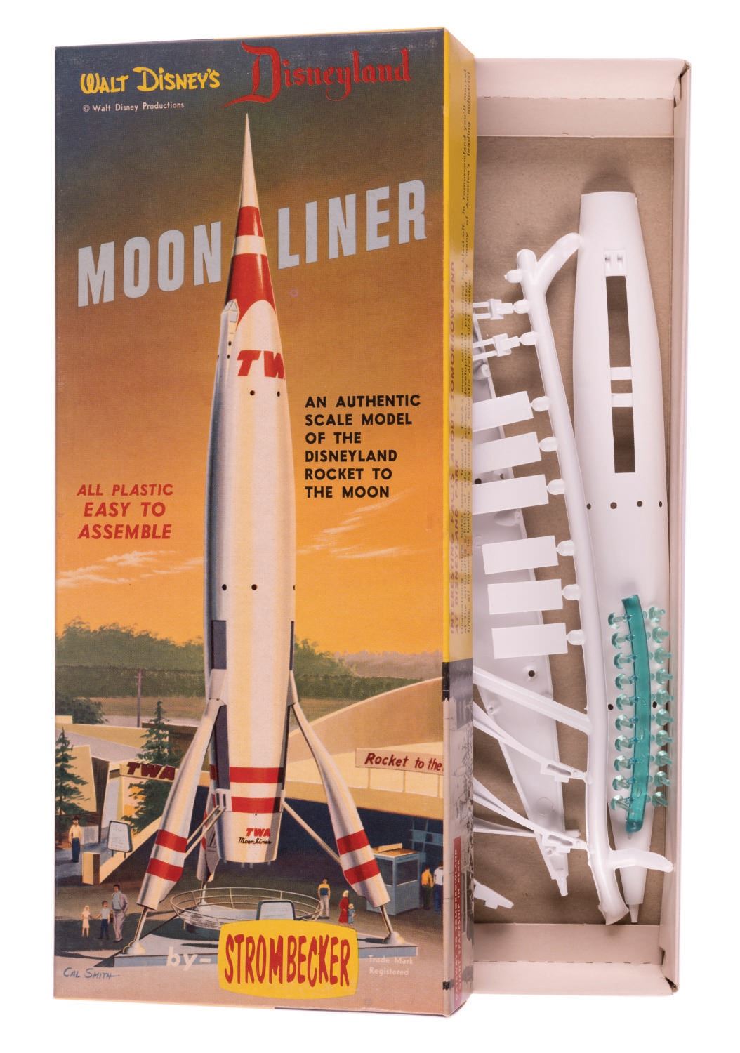 (Strombecker, 1950s-60s) An original and rare scale model of the Disneyland Rocket to the Moon attraction. This rare edition of the kit features a lid reading "Walt Disney's Disneyland Moonliner." The set is complete with model parts, decals, and instruction sheet/wall poster. The box measures 5"x12" and 1.25" deep, with crisp instruction sheet and unpunched parts, and is in fine condition.
