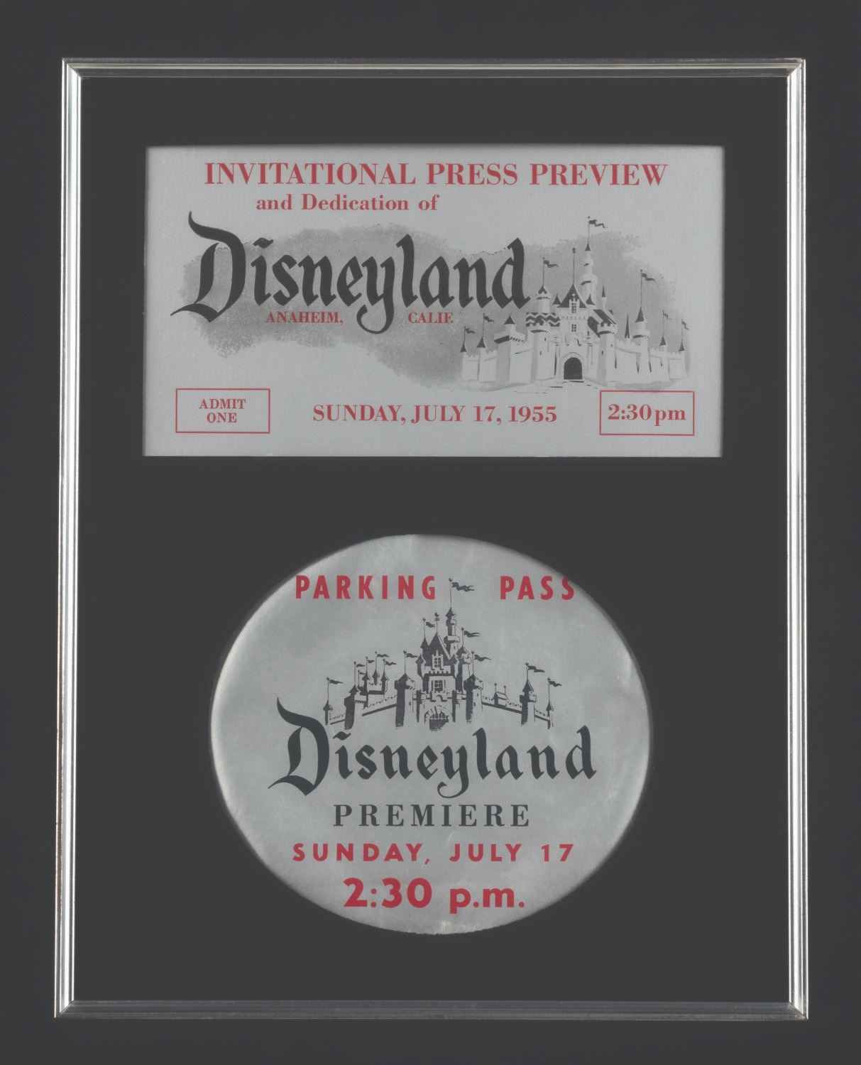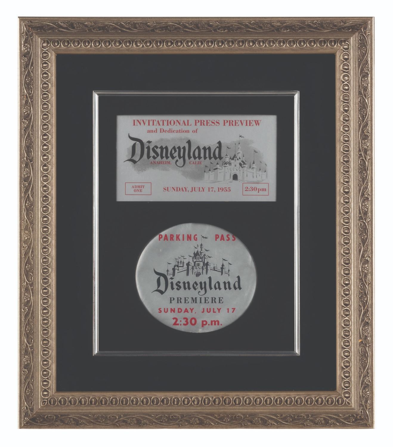 (Disneyland, 1955) A very rare Silver Invitational Press Preview admission ticket and Parking Pass to the Premiere of Disneyland on Sunday, July 17, 1955. Because Disneyland's opening day events were being broadcast on live TV, VIPs were requested to arrive at different times to accommodate the televised ceremonies. This pass features an entrance time of 2:30 pm. The parking pass is extremely rare as they were adhered to vehicles and many did not survive. The pieces are mounted to board and presented within a frame with 6"x3.25" of the admission visible and a 4.75" diameter area of the parking Pass visible. Each piece is presents in good condition, exhibiting creases and wear throughout. They have not been examined out of the frame.
