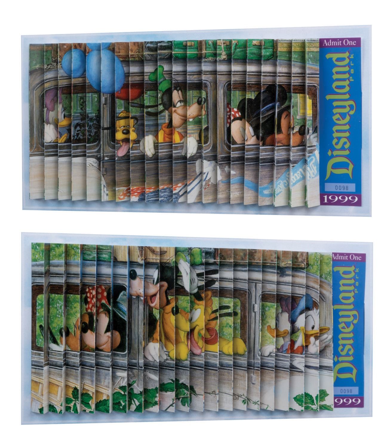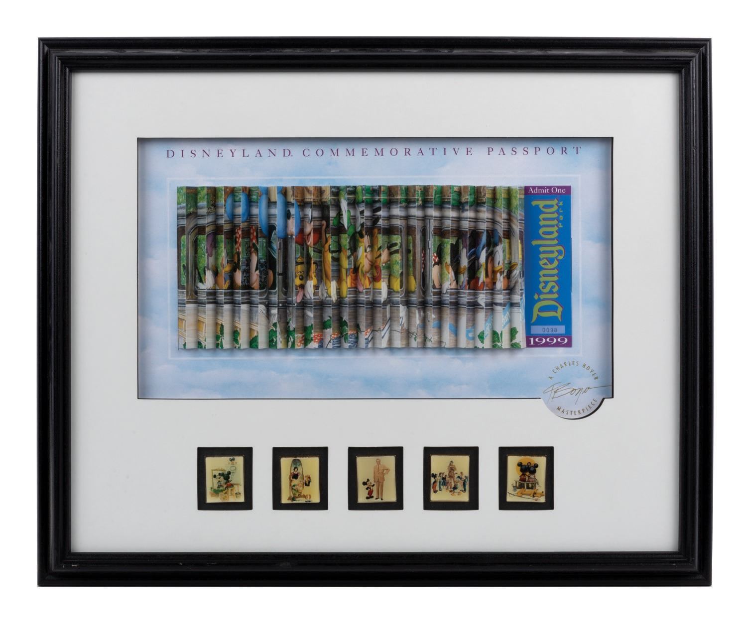 (Disneyland, 1999) A limited edition commemorative Disneyland passport featuring the artwork "A Disneyland Outing" by Disney Legend Charles Boyer. Created for the 45th Anniversary of Disneyland, the passport features accordian-style folds so that it can be viewed two-ways: from the left, Mickey and friends are eagerly arriving at the park, and from the right, Mickey and friends are leaving the park. The passport comes beautifully framed with a set of (5) pins featuring some of Boyer's other memorable Disney masterpieces. The passport measures 5"x12.5" within the 17.5"x21.5" frame. The condition of the passport is very fine, while the pins are in very good condition, exhibiting slight yellowing and wear to their imagery.