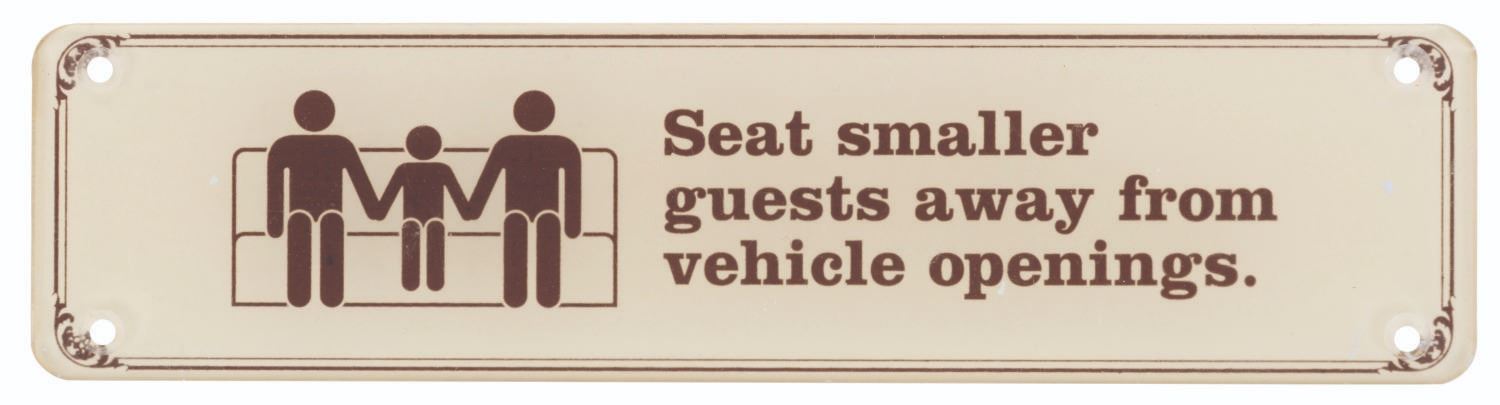 (Disneyland, 1980s-2000s) A "Seat smaller guests away from vehicle openings" sign from Disneyland Railroad cars. Measuring 2" x 8.25", the acrylic sign is in very good condition with light wear from Park use.