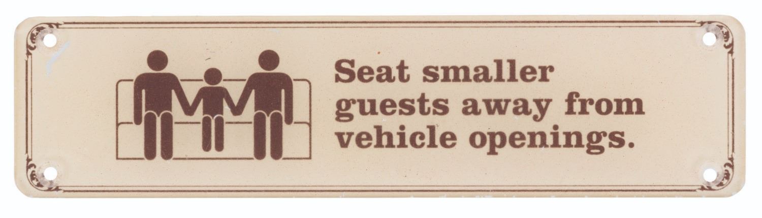 (Disneyland, 1980s-2000s) A "Seat smaller guests away from vehicle openings" sign from Disneyland Railroad cars. Measuring 2" x 8.25", the acrylic sign is in very good condition with light wear from Park use.