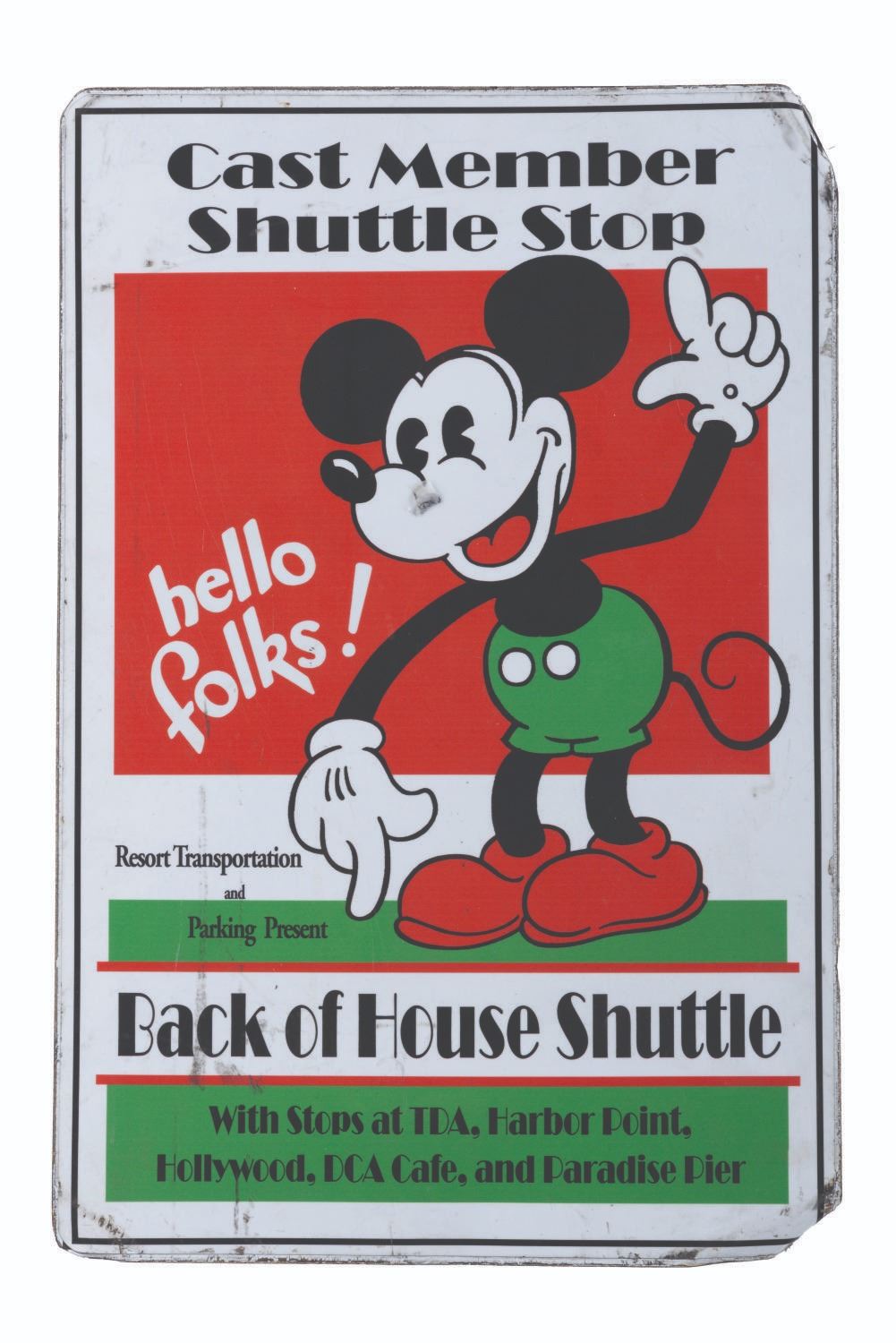 (Disneyland Resort, 2001-18) A Disneyland Resort Transportation sign identifying a Back of House Shuttle stop that transported Cast Members from the entrance at Harbor Pointe to various other stops. Measuring 12"x18", the metal sign is in good condition exhibiting scuffs, scratches, dust retention, and wear from its original Resort display.