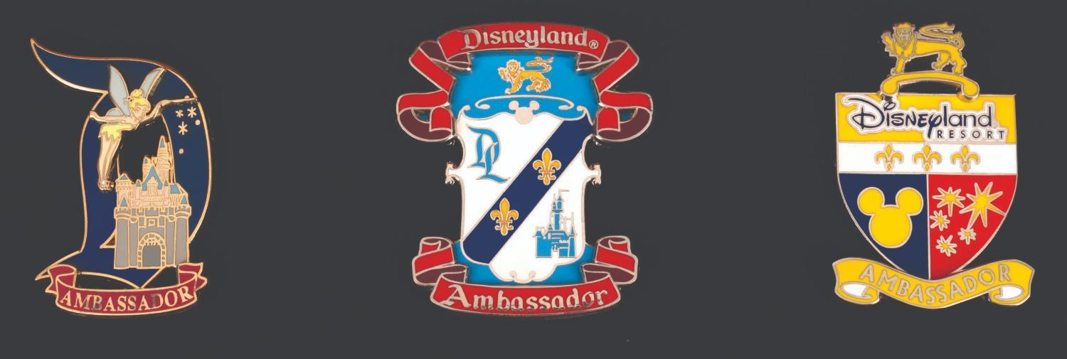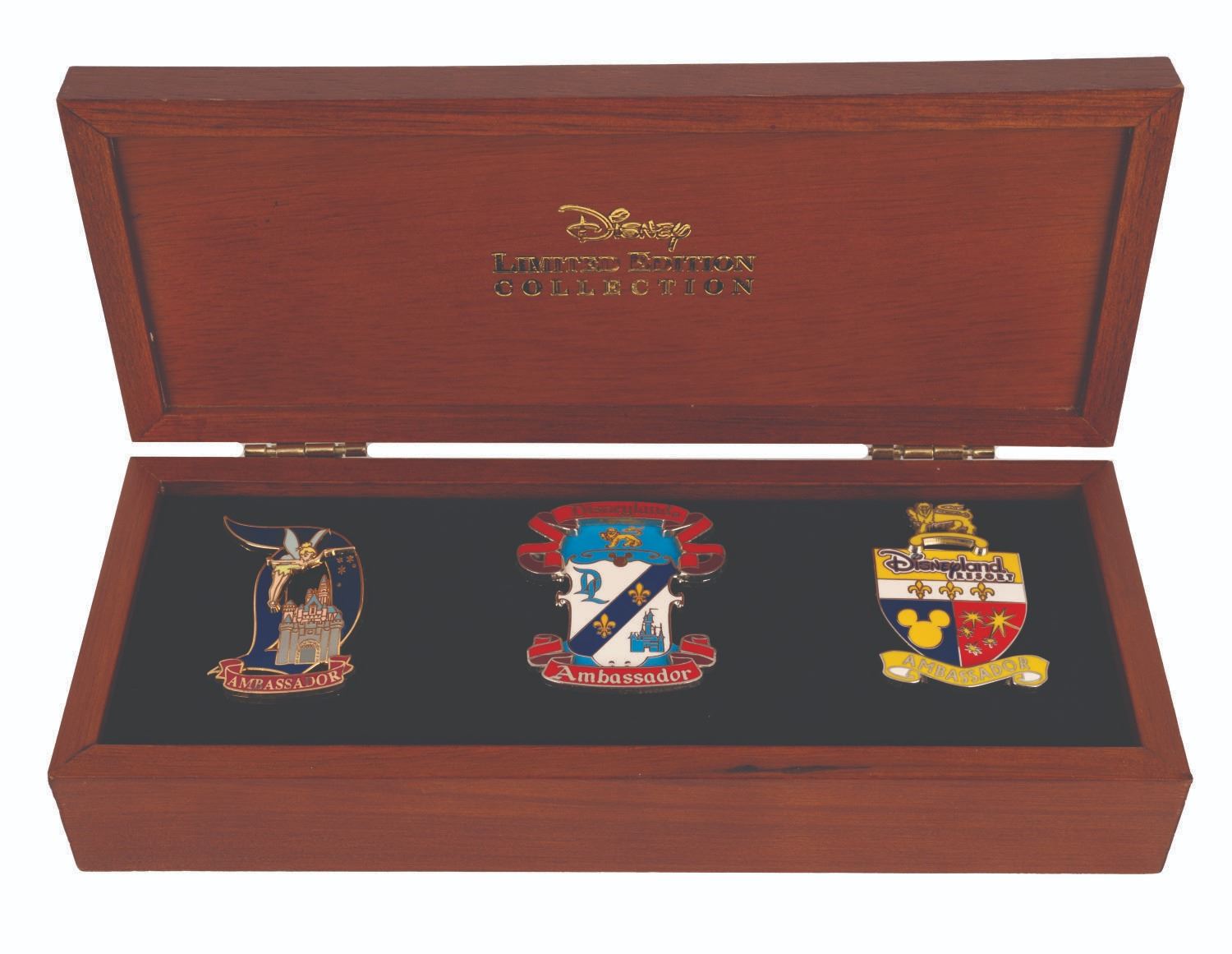 (Disneyland, 2003) A Disneyland Resort Collection Ambassador three-pin set. Each pin was limited to an edition of 750 and features the regal shield of the distinguished Disneyland Resort Ambassador program. The pins are in fine condition and are accompanied by their original 7.75"x3"x3.75" wooden box which is in very good condition exhibiting a few small chips and light wear.